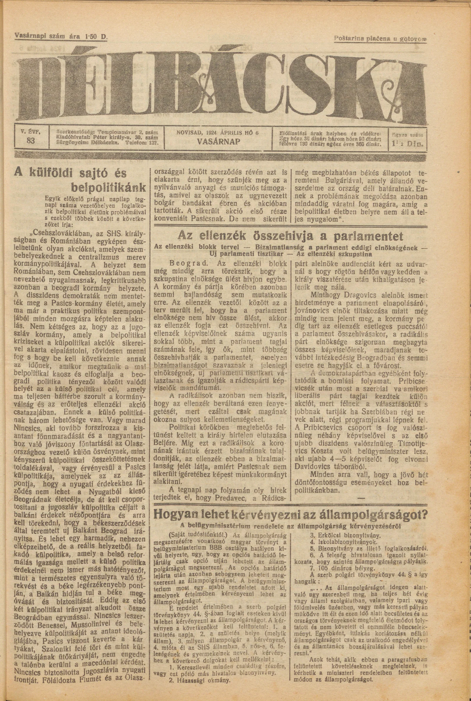 Délbácska, 5. évf. 1924. április 6. 83. sz.