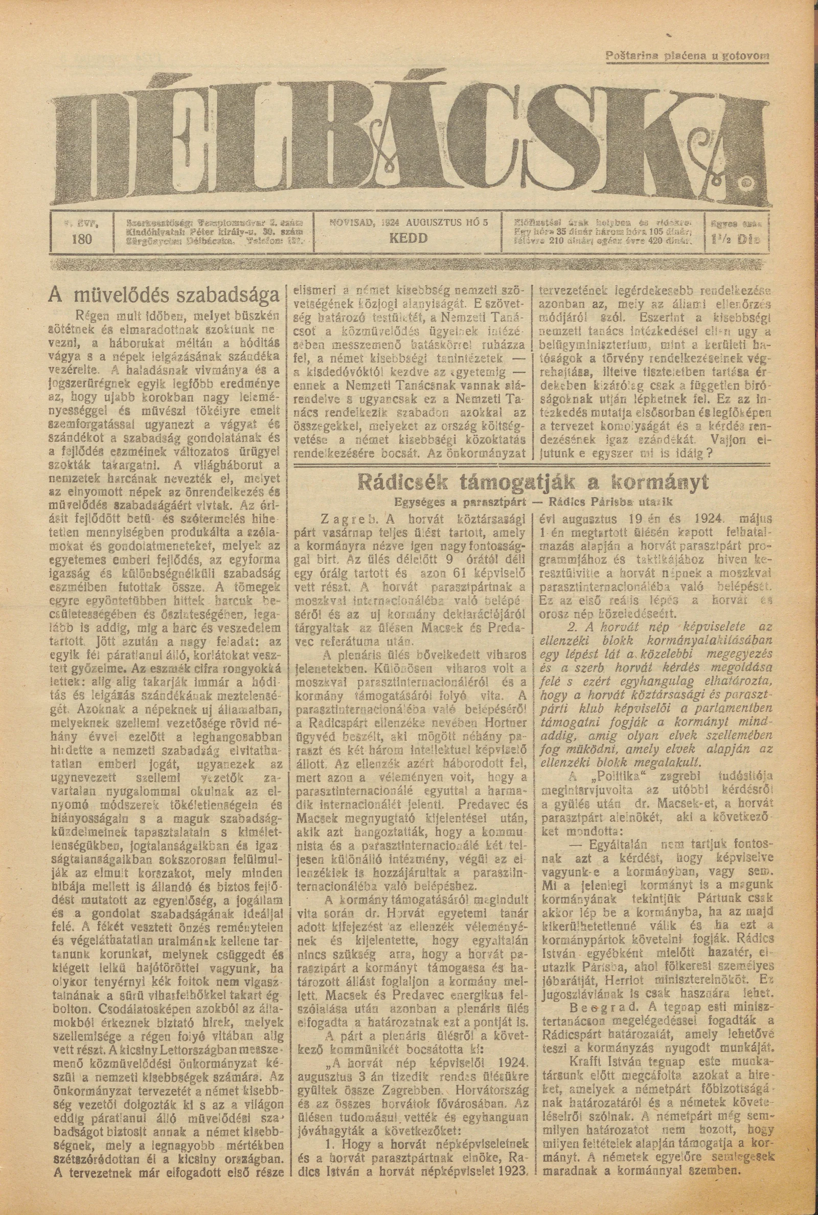 Délbácska, 5. évf. 1924. augusztus 5. 180. sz.
