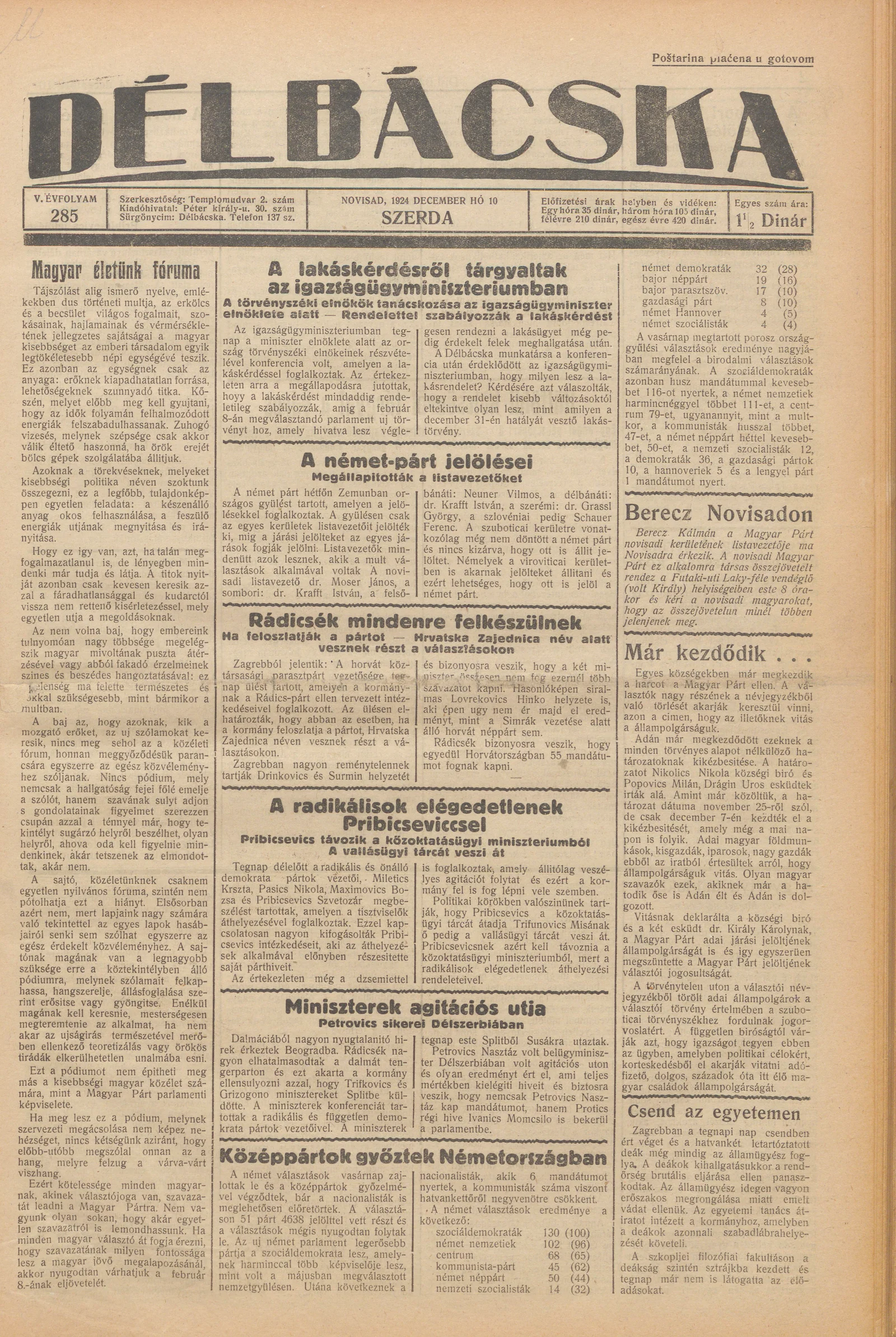 Délbácska, 5. évf. 1924. december 10. 285. sz.