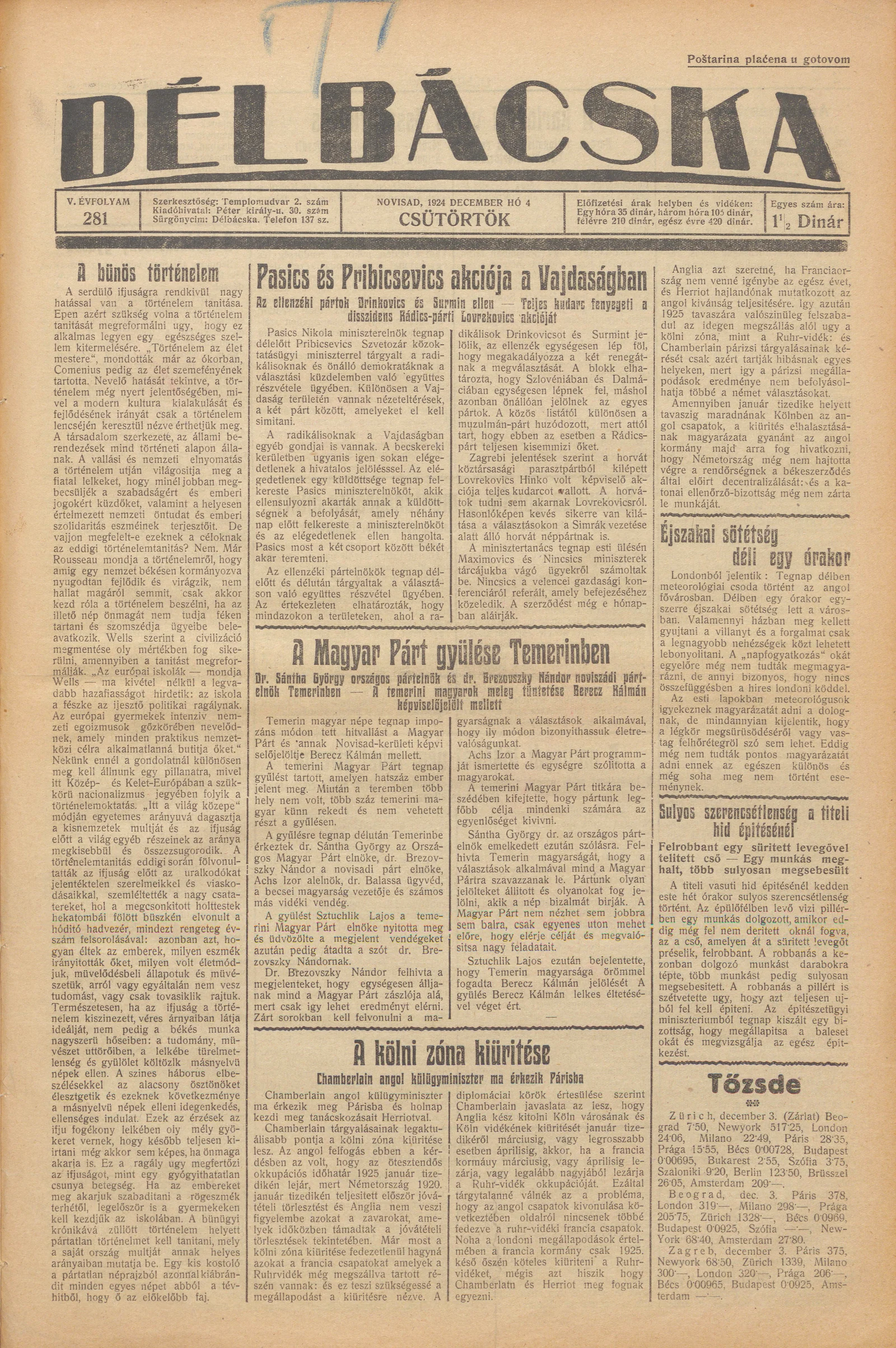 Délbácska, 5. évf. 1924. december 4. 281. sz.