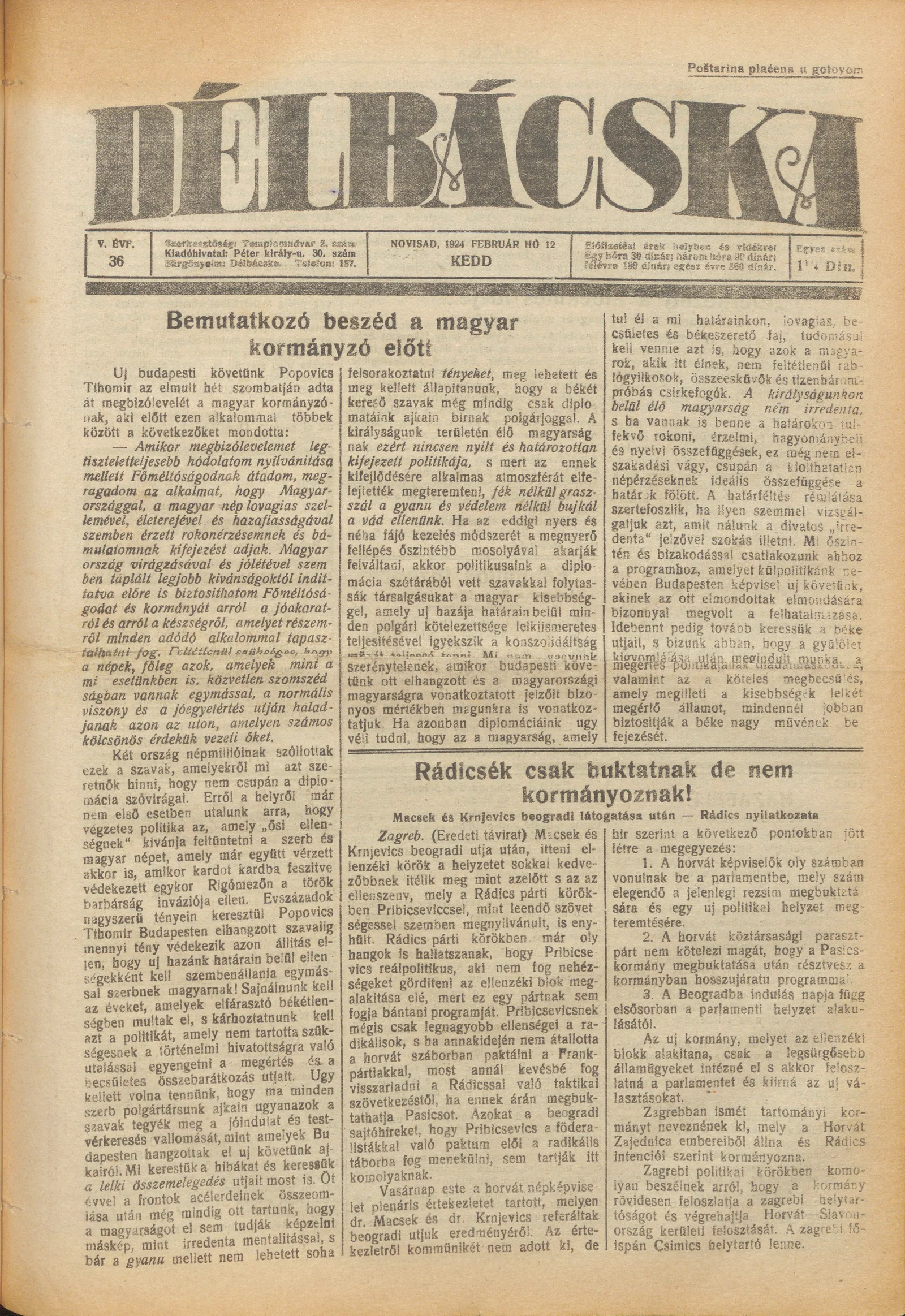 Délbácska, 5. évf. 1924. február 12. 36. sz.