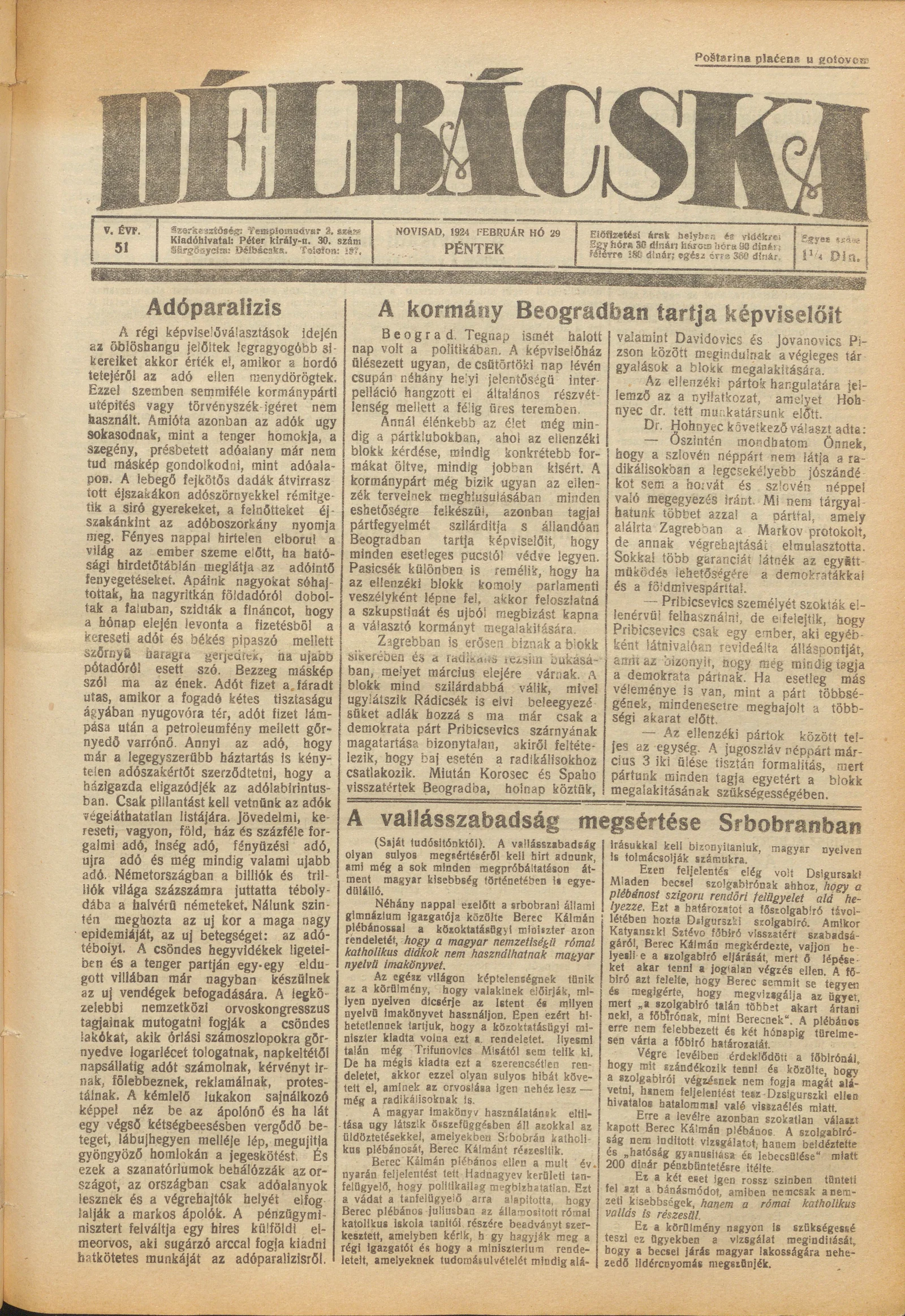 Délbácska, 5. évf. 1924. február 29. 51. sz.