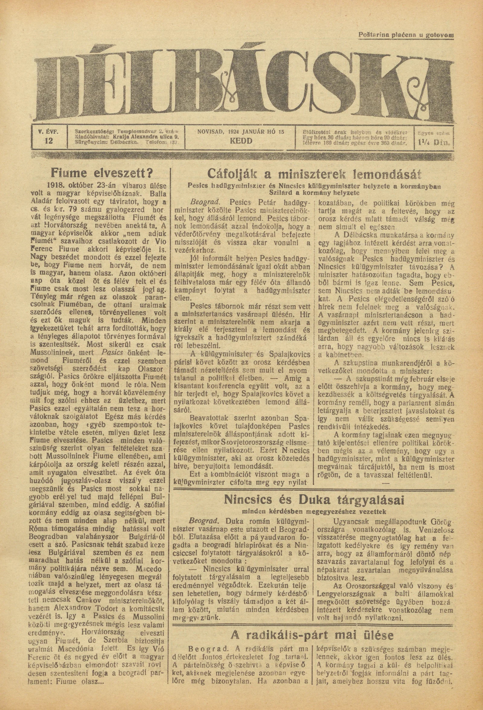 Délbácska, 5. évf. 1924. január 15. 12. sz.