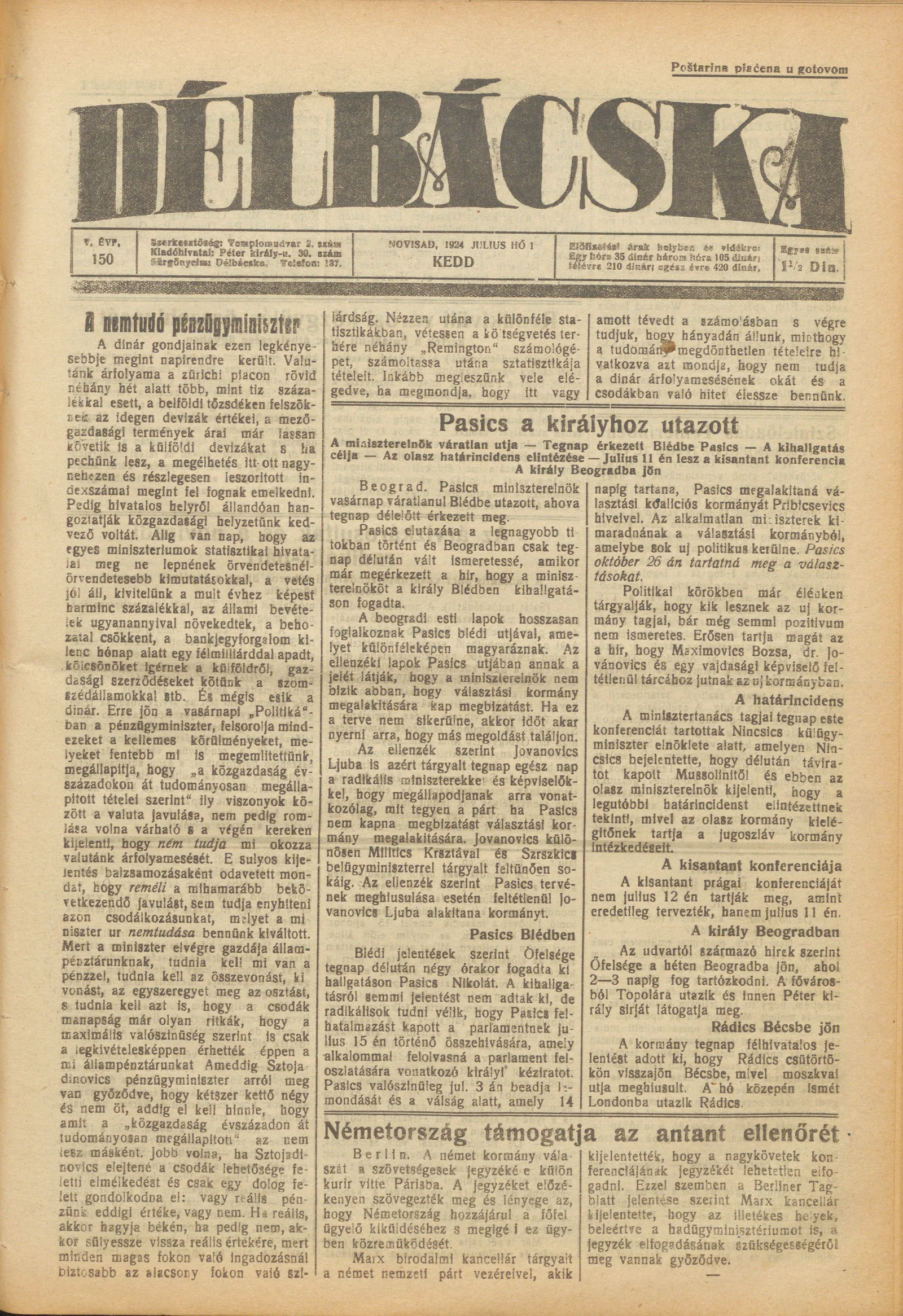 Délbácska, 5. évf. 1924. július 1. 150. sz.