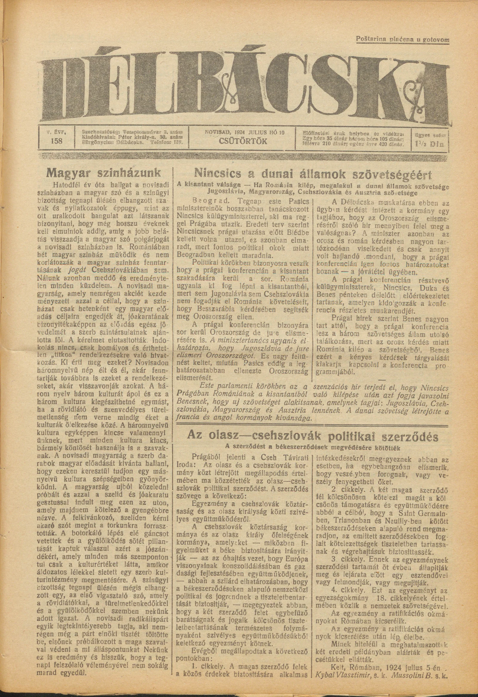 Délbácska, 5. évf. 1924. július 10. 158. sz.