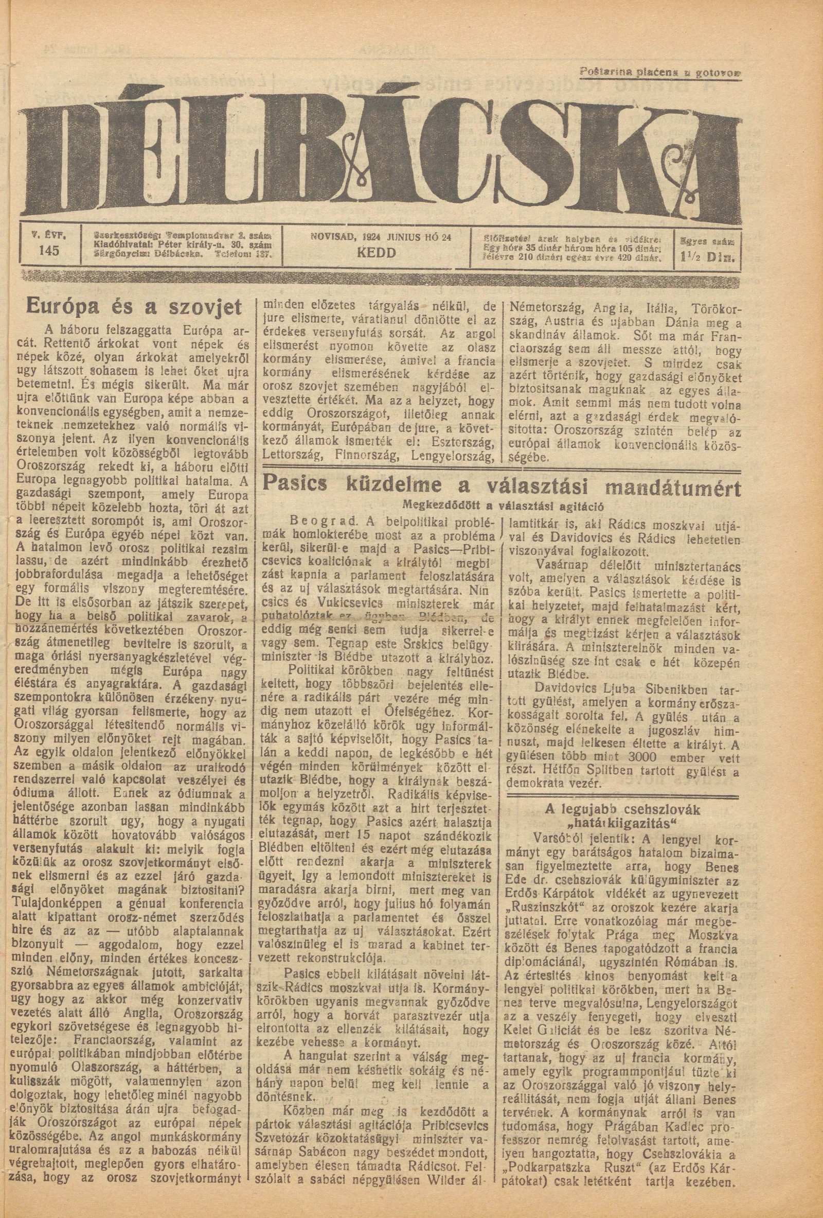Délbácska, 5. évf. 1924. június 24. 145. sz.