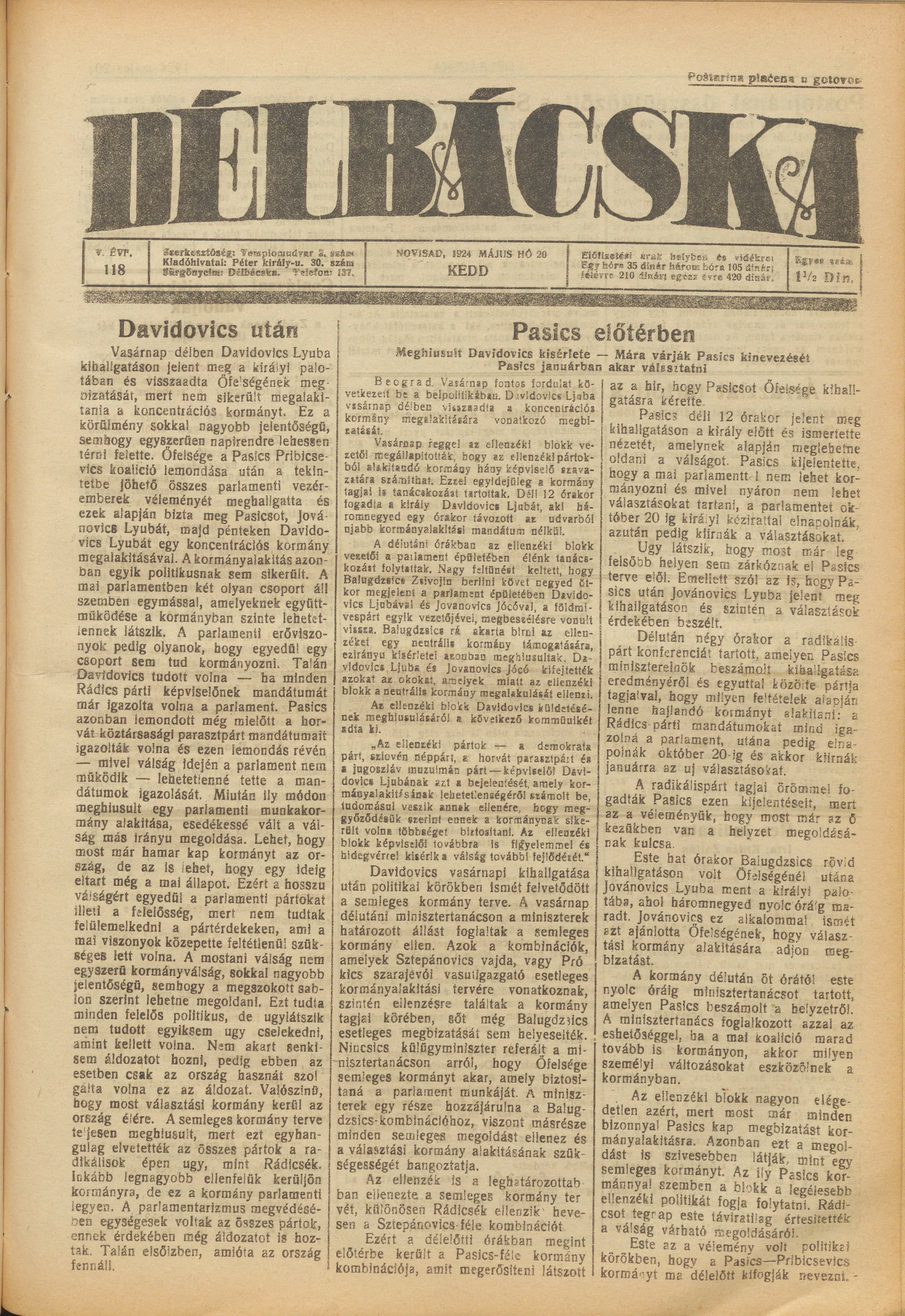 Délbácska, 5. évf. 1924. május 20. 118. sz.