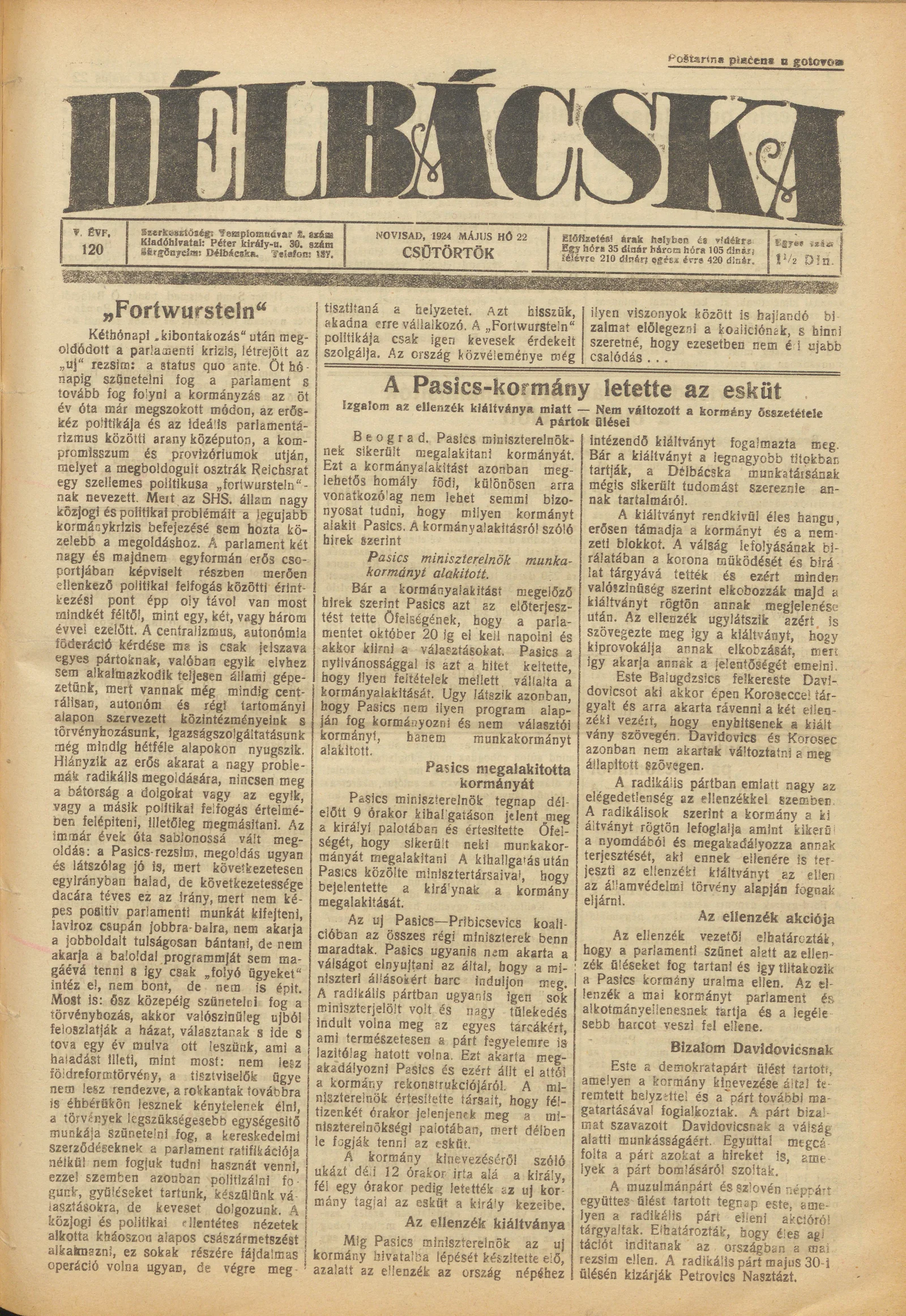 Délbácska, 5. évf. 1924. május 22. 120. sz.