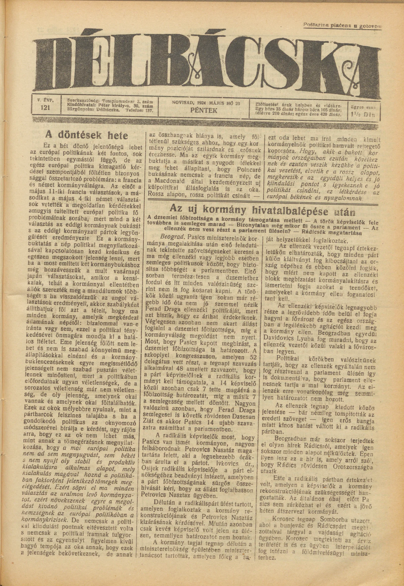 Délbácska, 5. évf. 1924. május 23. 121. sz.