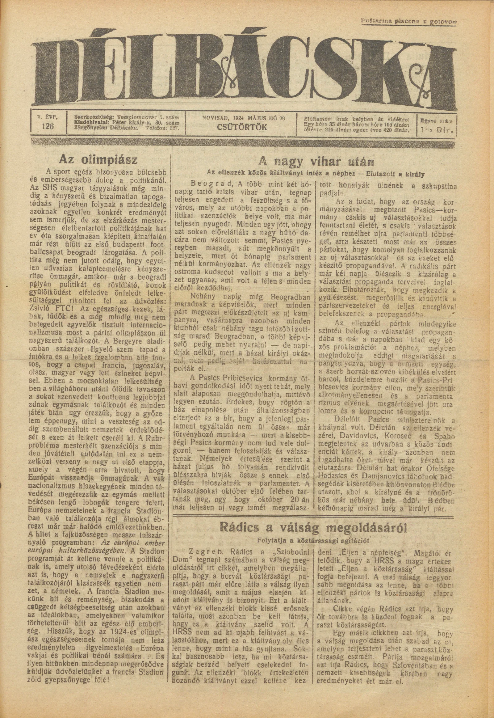 Délbácska, 5. évf. 1924. május 29. 126. sz.