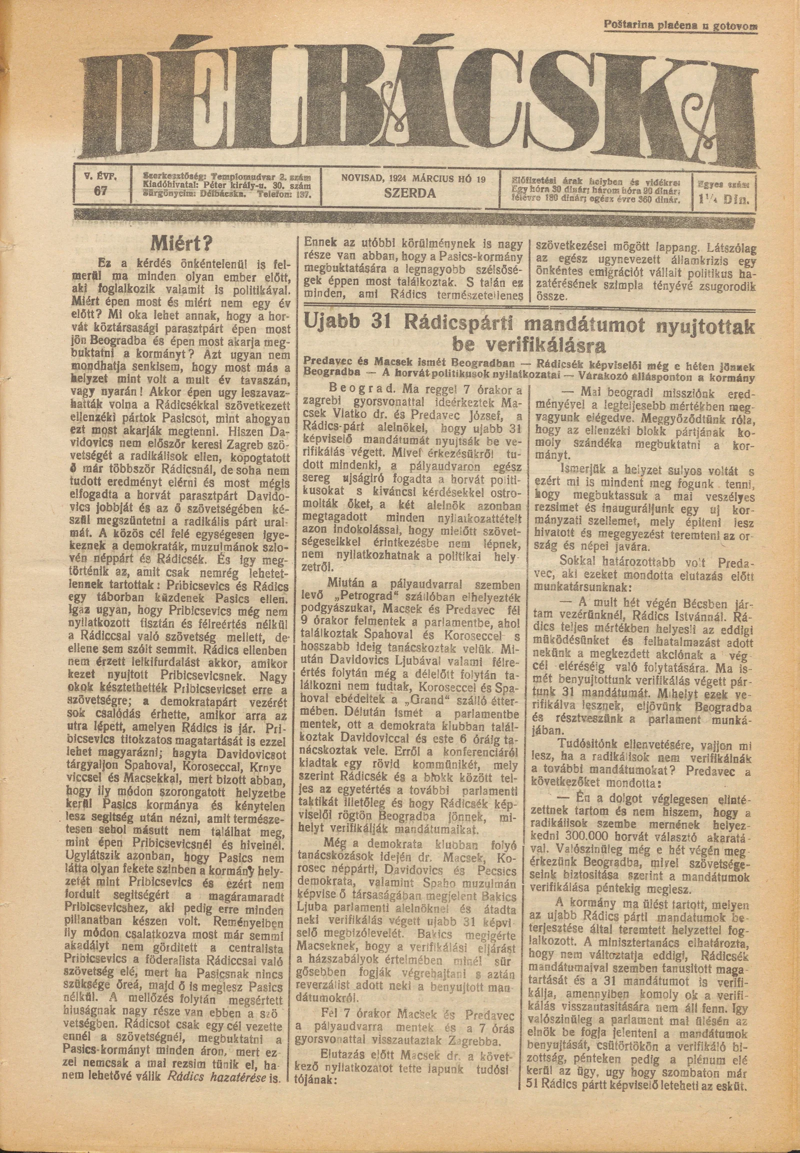 Délbácska, 5. évf. 1924. március 19. 67. sz.