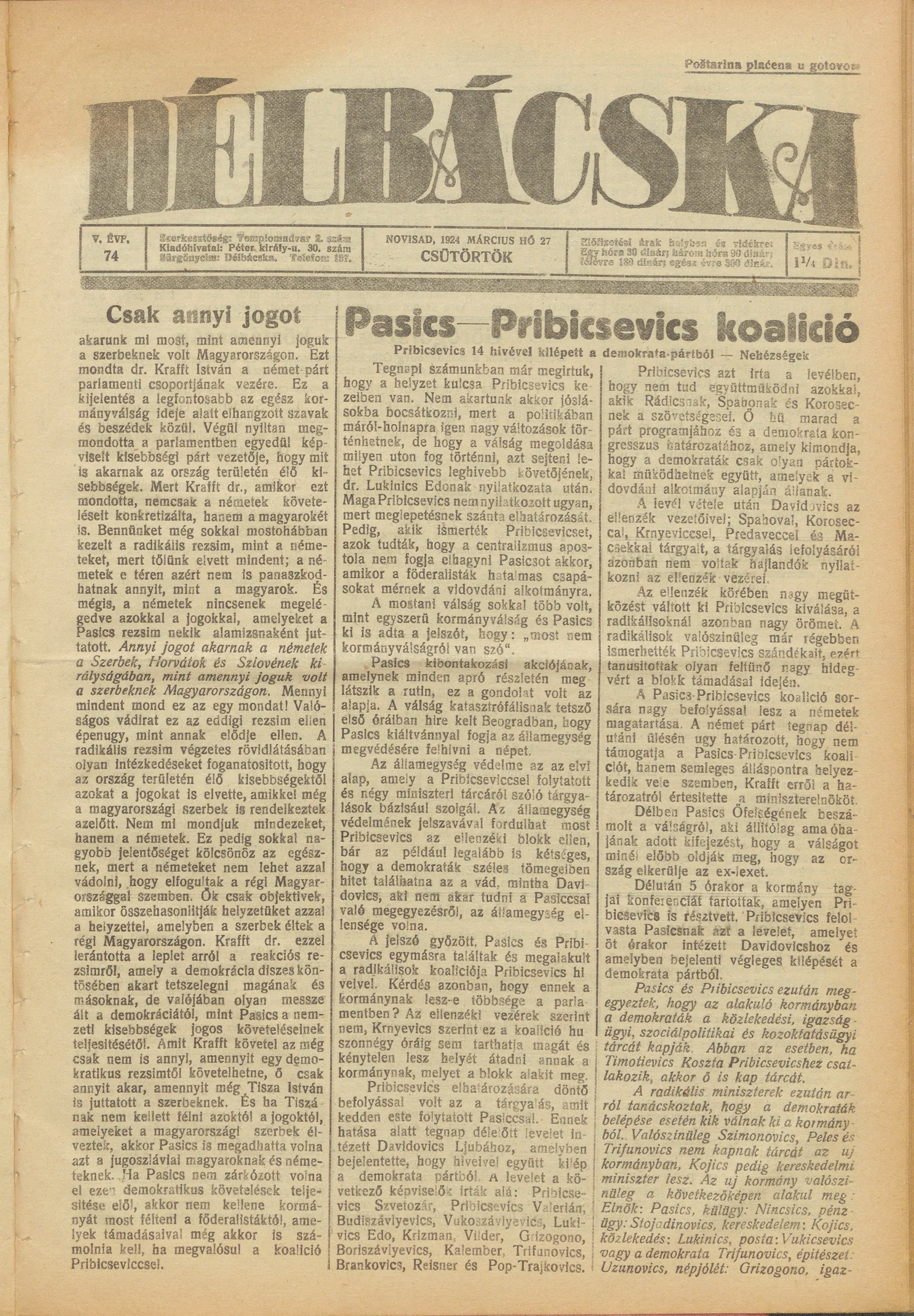 Délbácska, 5. évf. 1924. március 27. 74. sz.