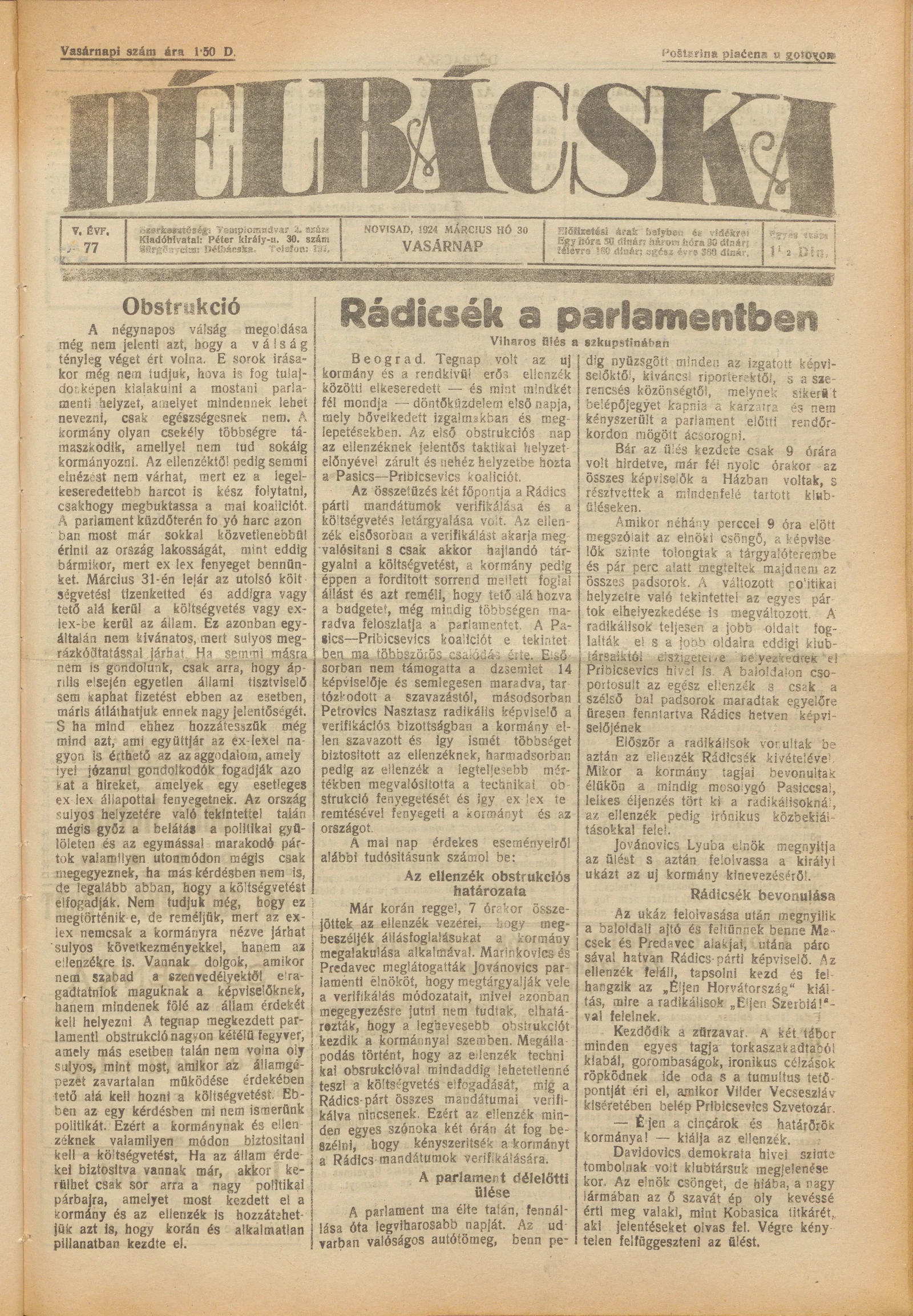 Délbácska, 5. évf. 1924. március 30. 77. sz.
