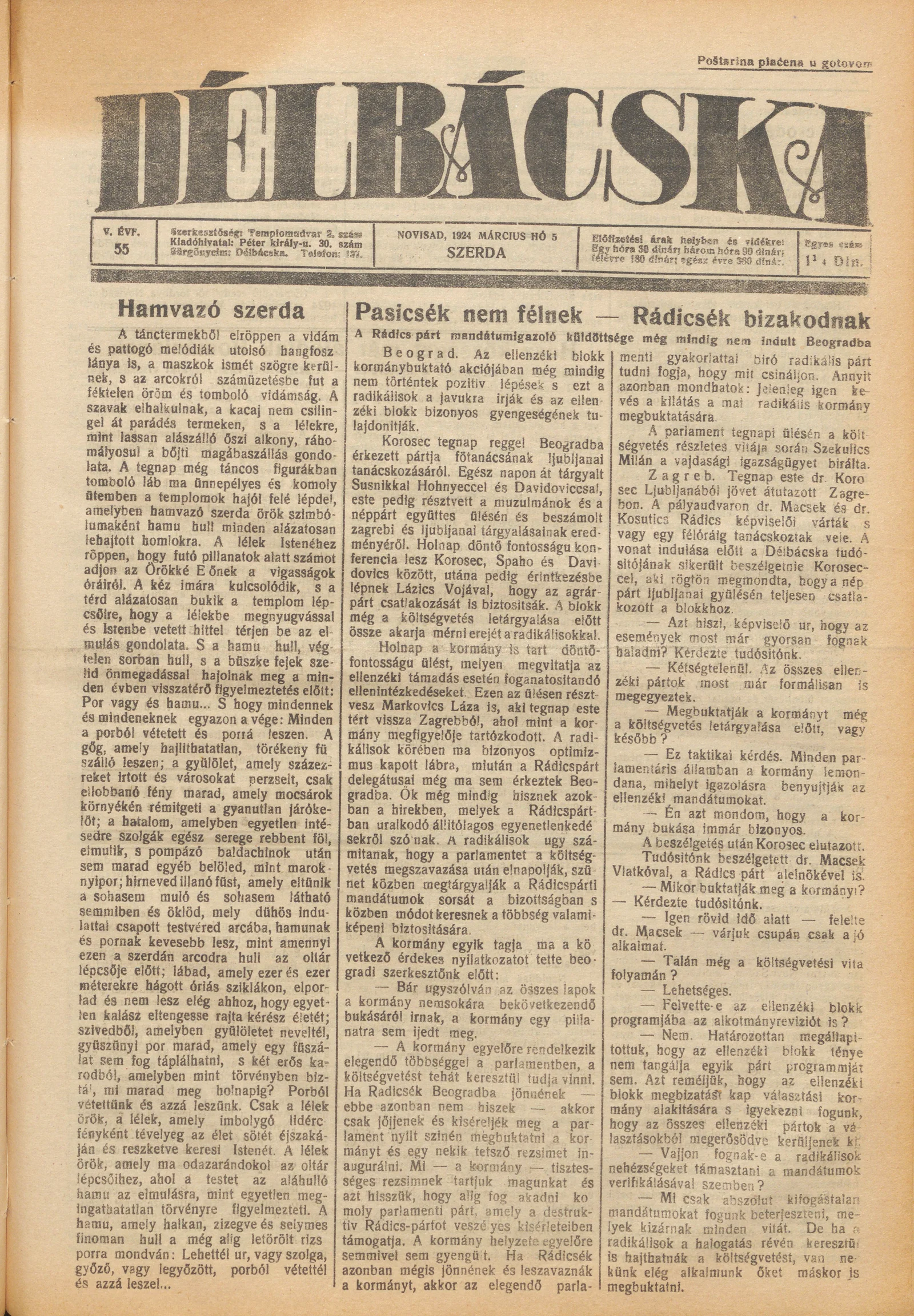 Délbácska, 5. évf. 1924. március 5. 55. sz.