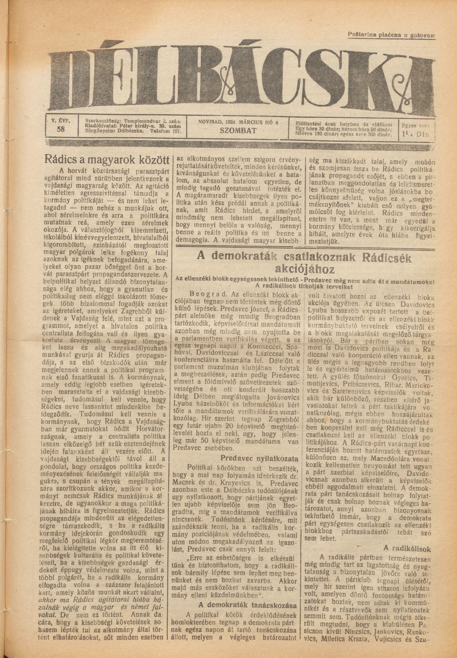 Délbácska, 5. évf. 1924. március 8. 58. sz.