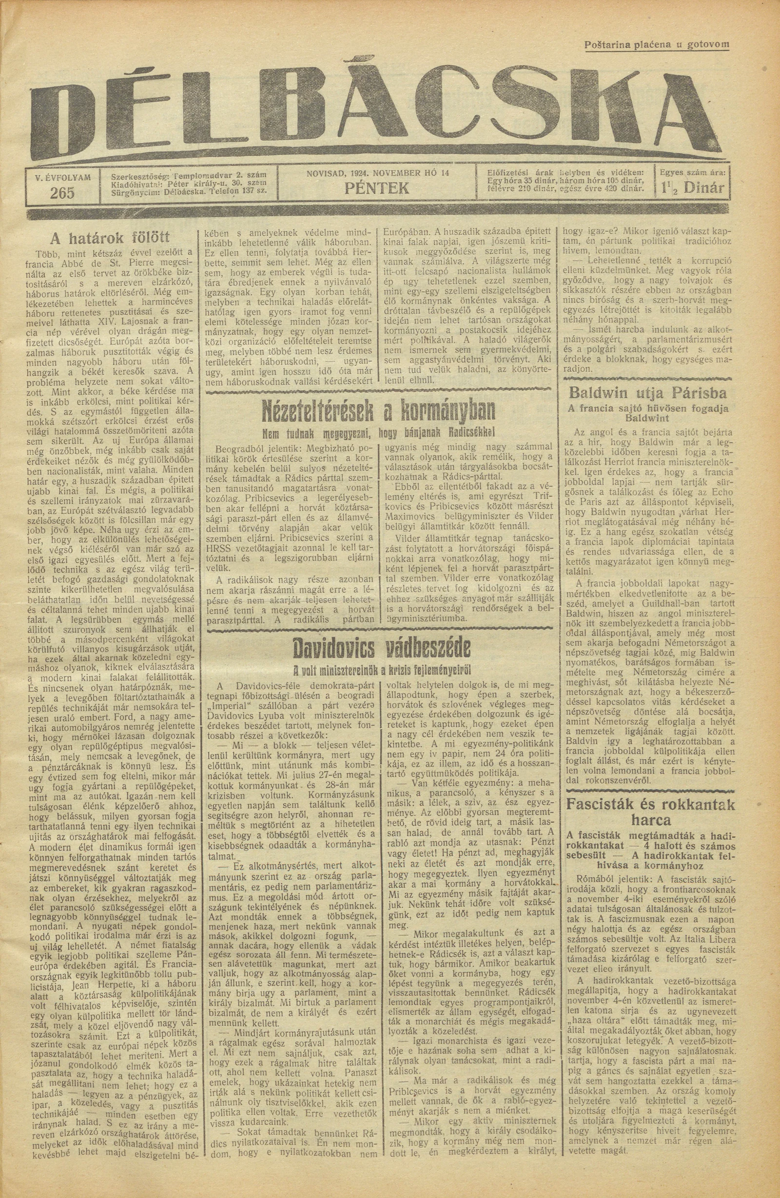 Délbácska, 5. évf. 1924. november 14. 265. sz.