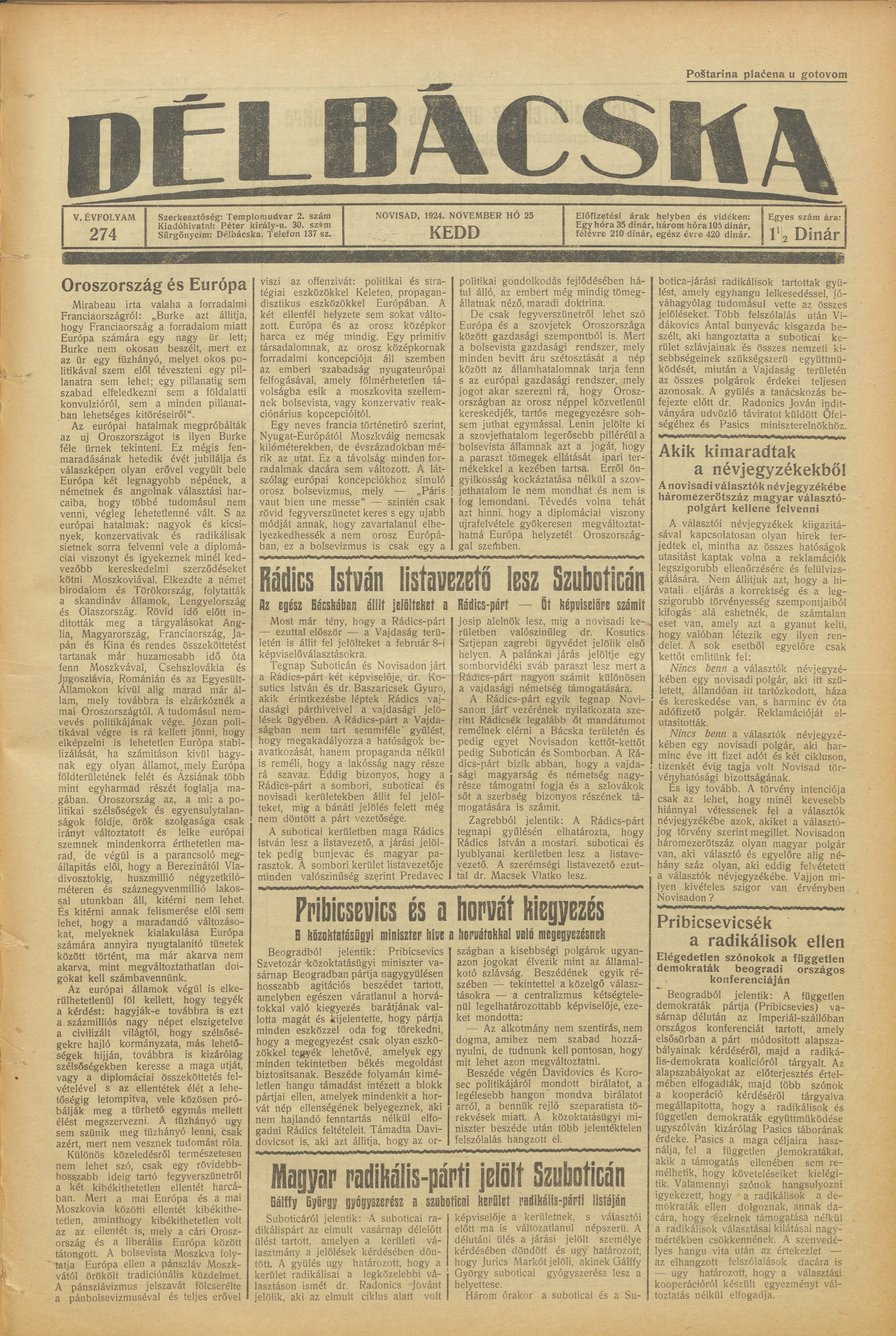 Délbácska, 5. évf. 1924. november 25. 274. sz.