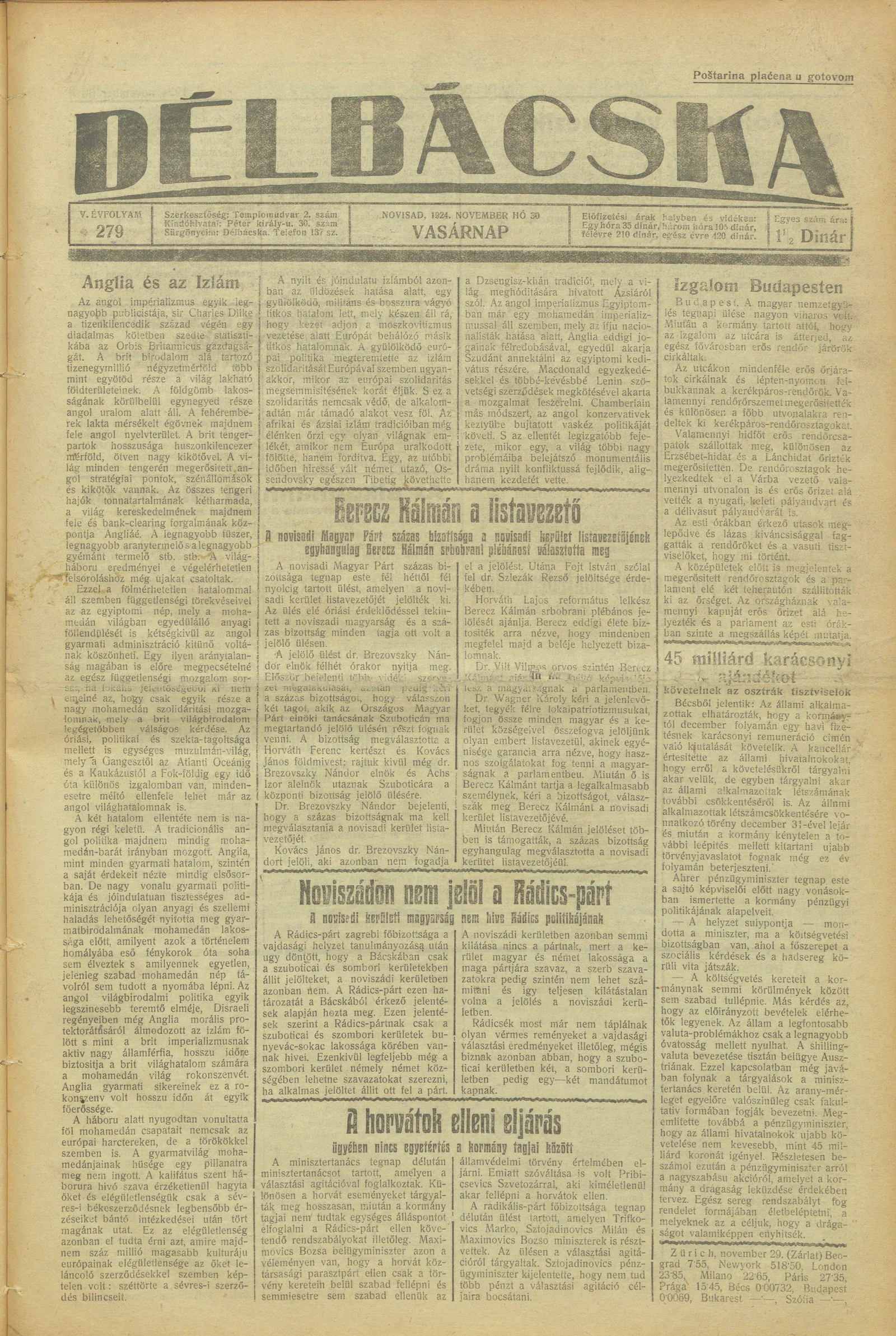 Délbácska, 5. évf. 1924. november 30. 279. sz.