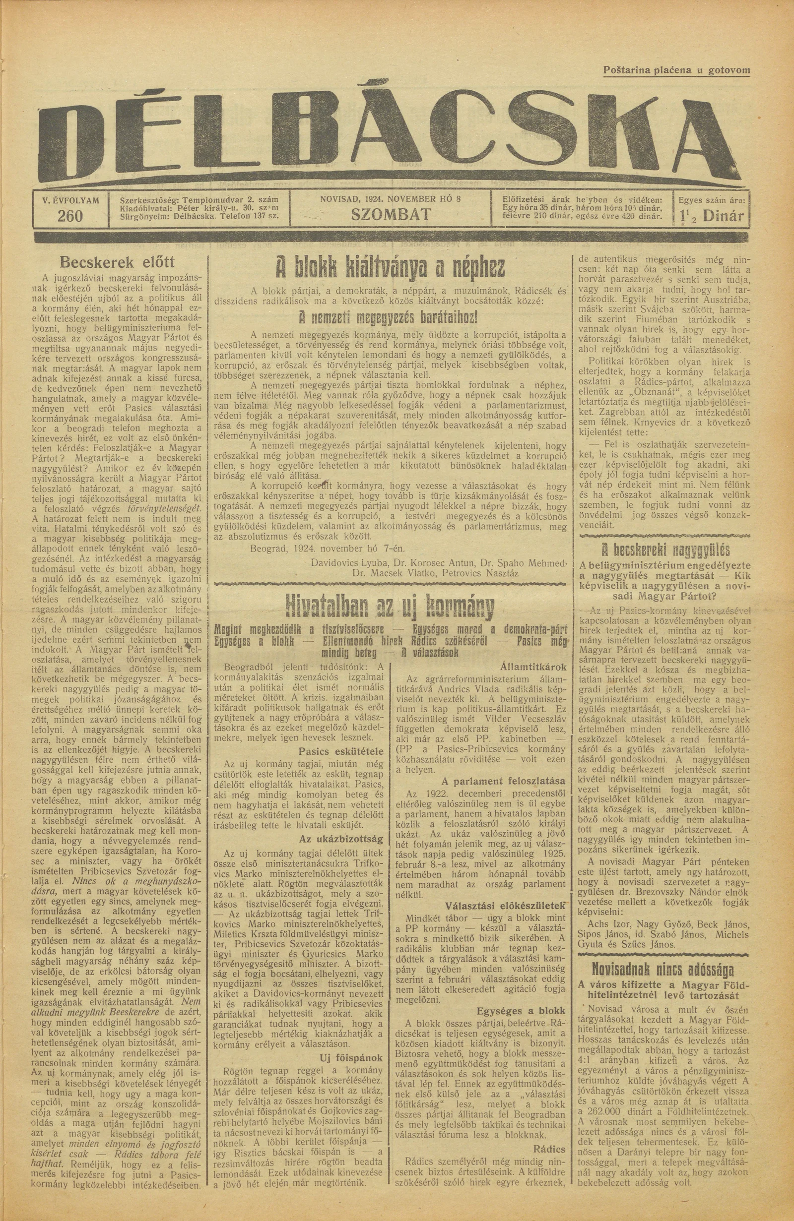 Délbácska, 5. évf. 1924. november 8. 260. sz.