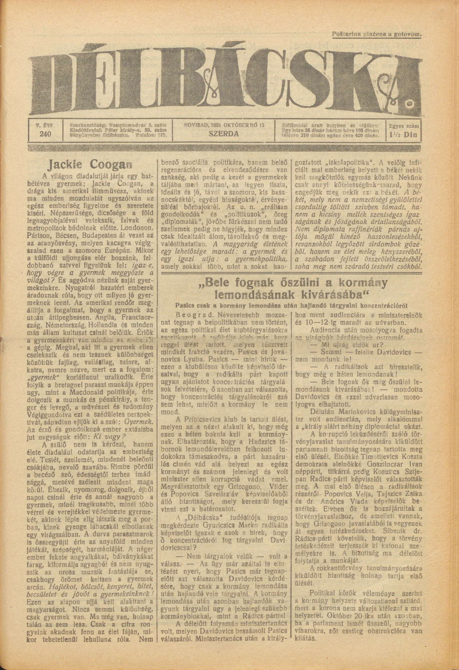 Délbácska, 5. évf. 1924. október 15. 240. sz.