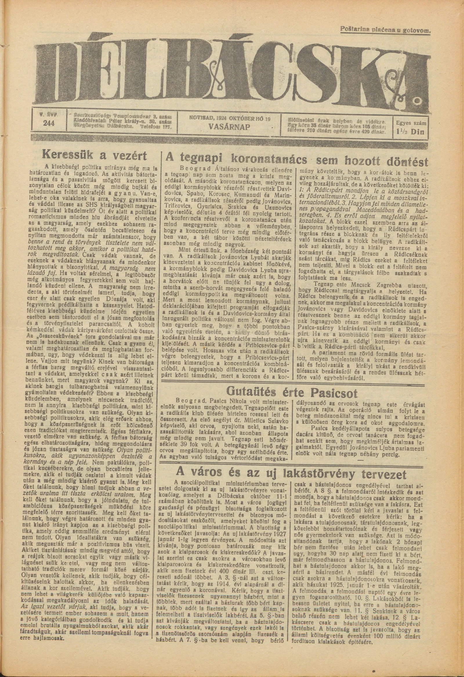 Délbácska, 5. évf. 1924. október 19. 244. sz.