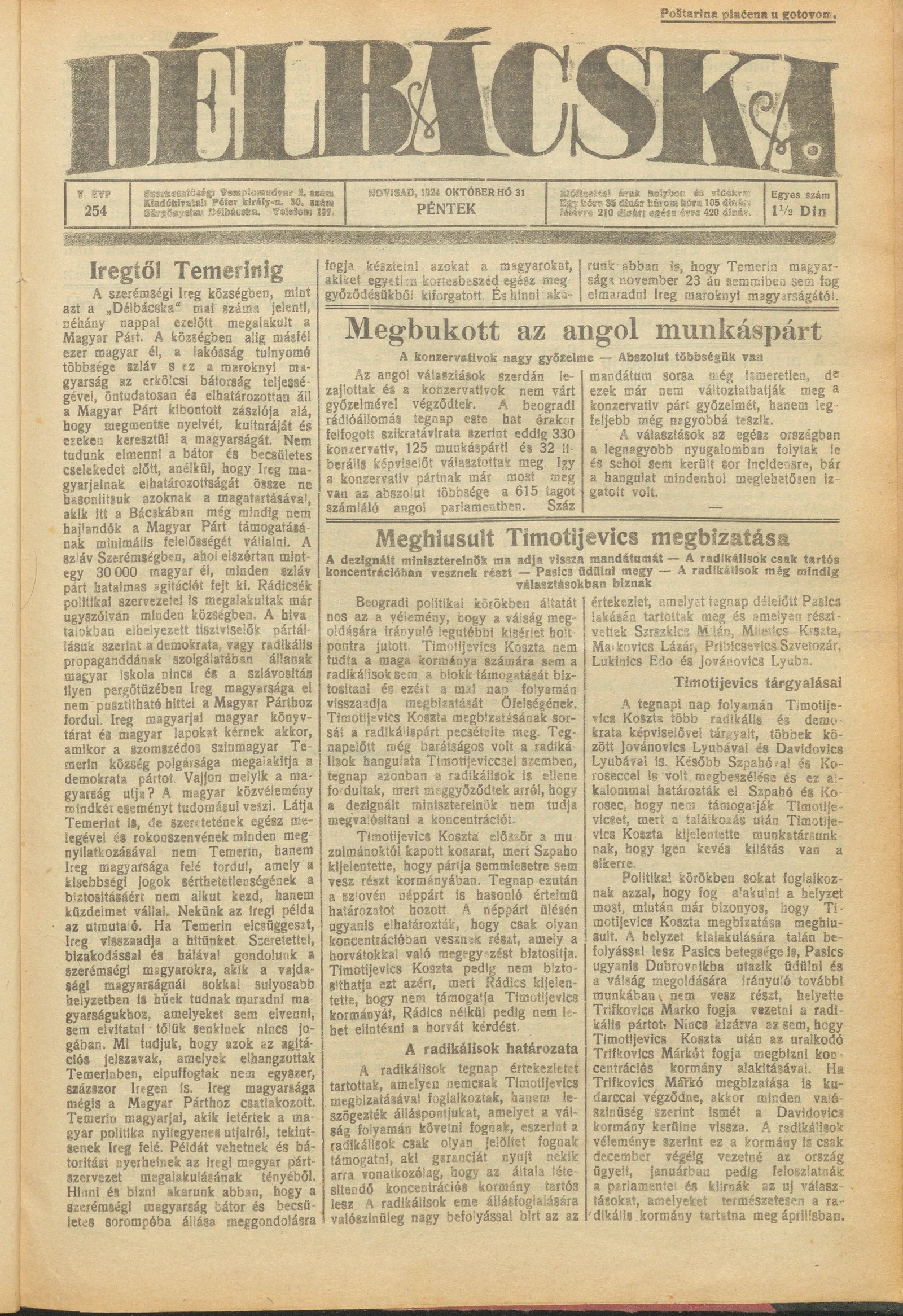 Délbácska, 5. évf. 1924. október 31. 254. sz.