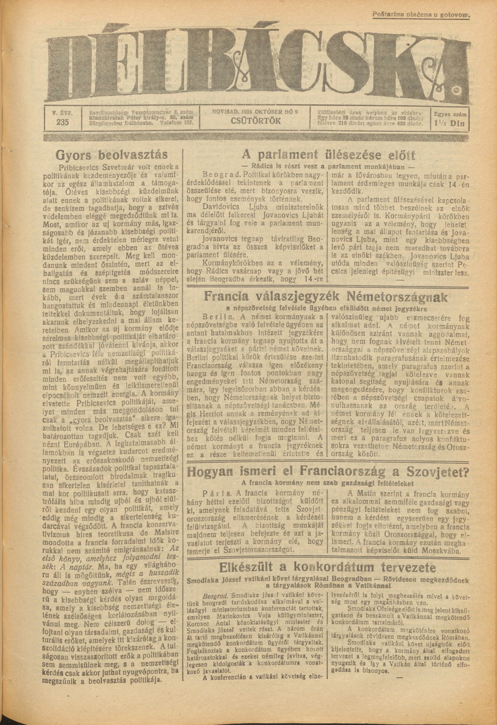 Délbácska, 5. évf. 1924. október 9. 235. sz.