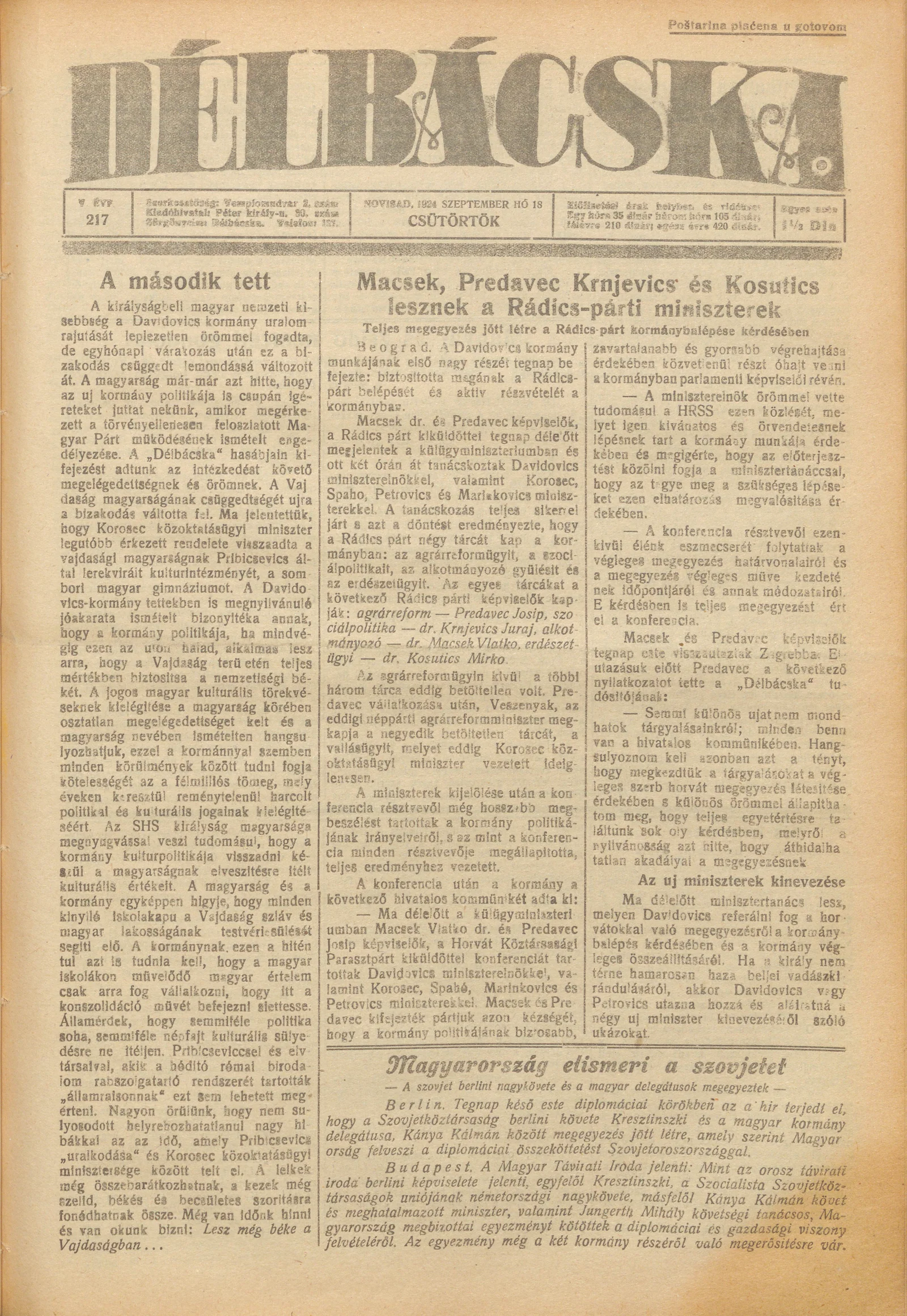 Délbácska, 5. évf. 1924. szeptember 18. 217. sz.