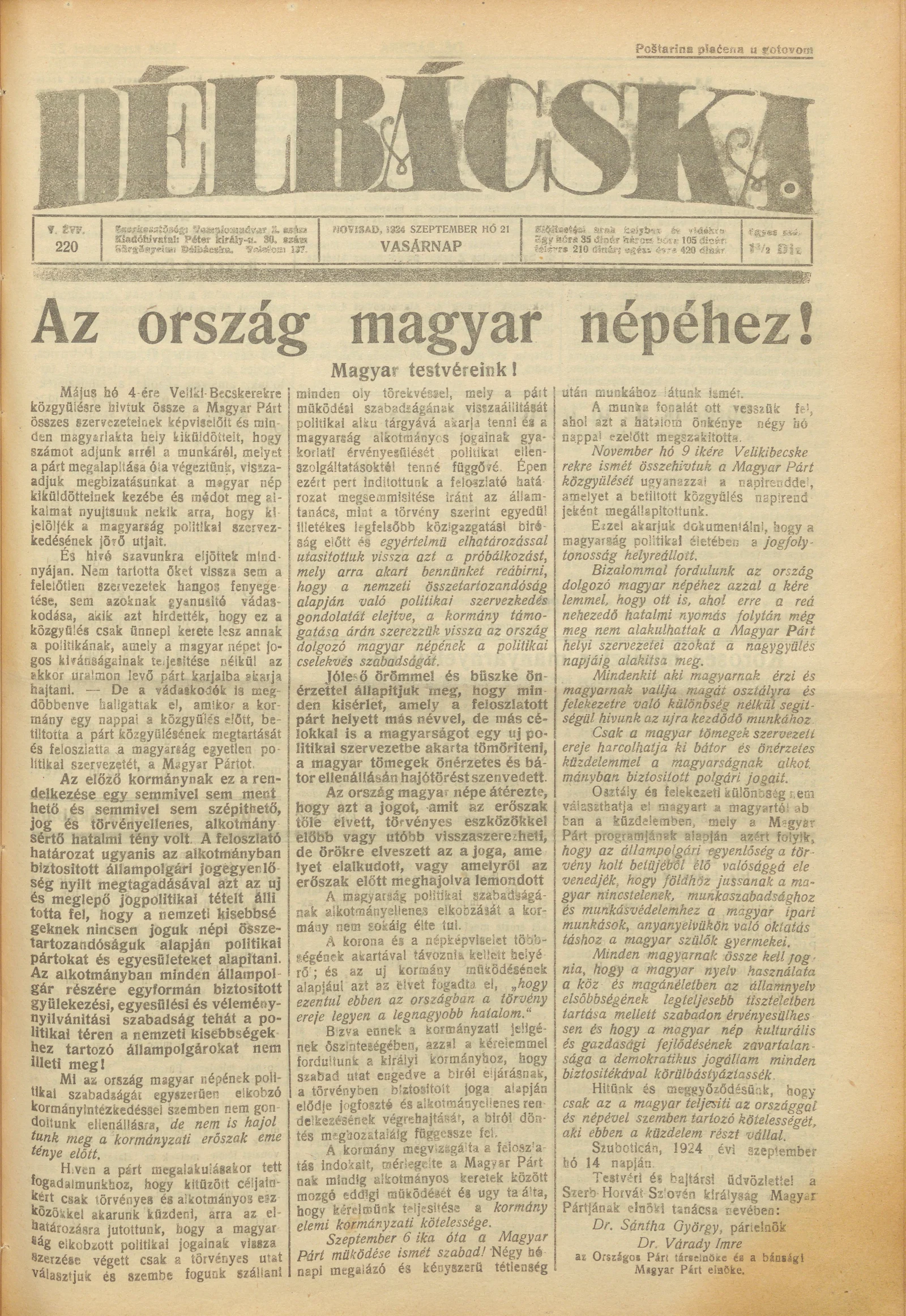 Délbácska, 5. évf. 1924. szeptember 21. 220. sz.