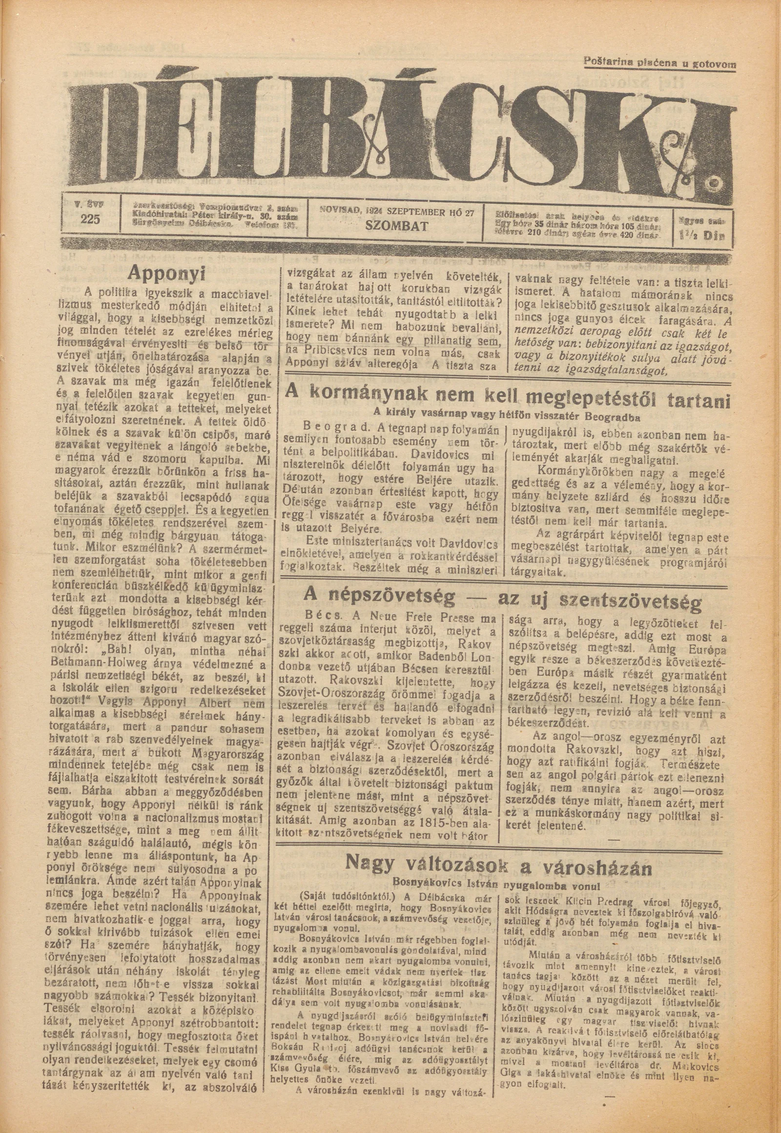 Délbácska, 5. évf. 1924. szeptember 27. 225. sz.