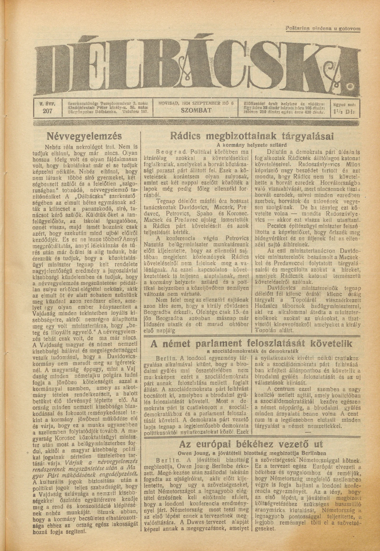 Délbácska, 5. évf. 1924. szeptember 6. 207. sz.