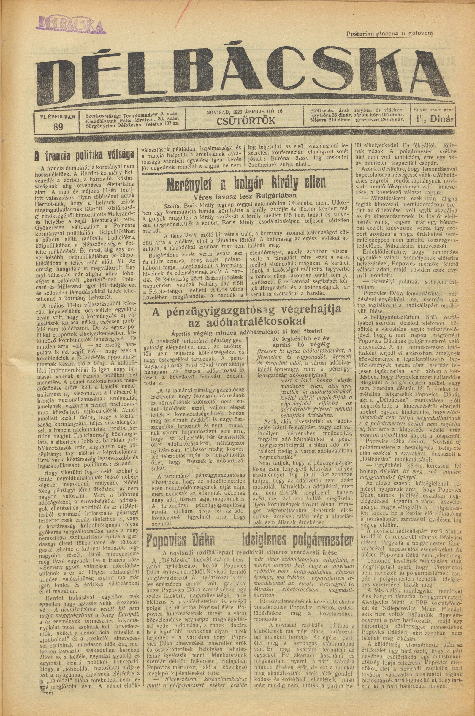 Délbácska, 6. évf. 1925. április 16. 89. sz.