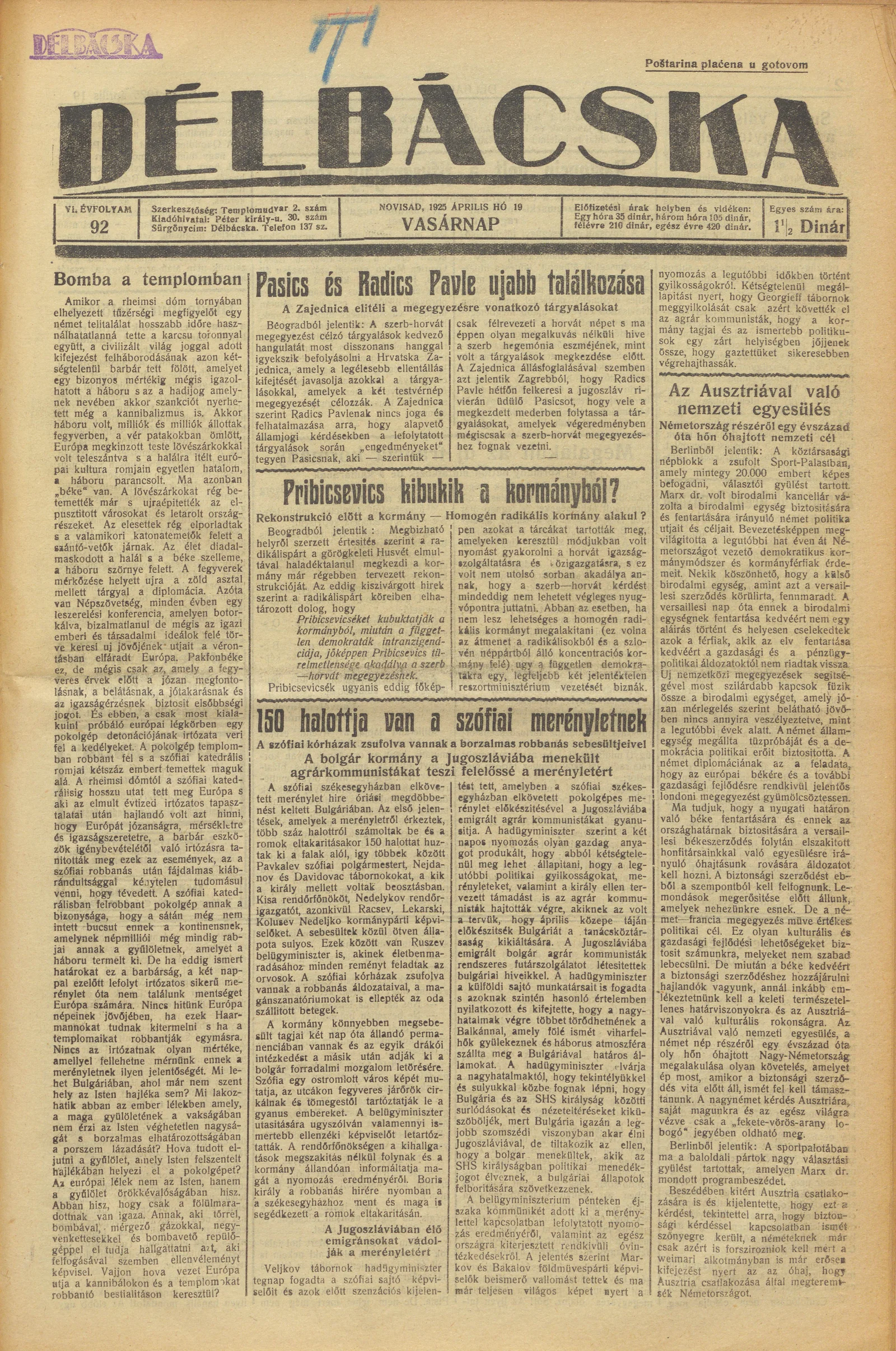 Délbácska, 6. évf. 1925. április 19. 92. sz.