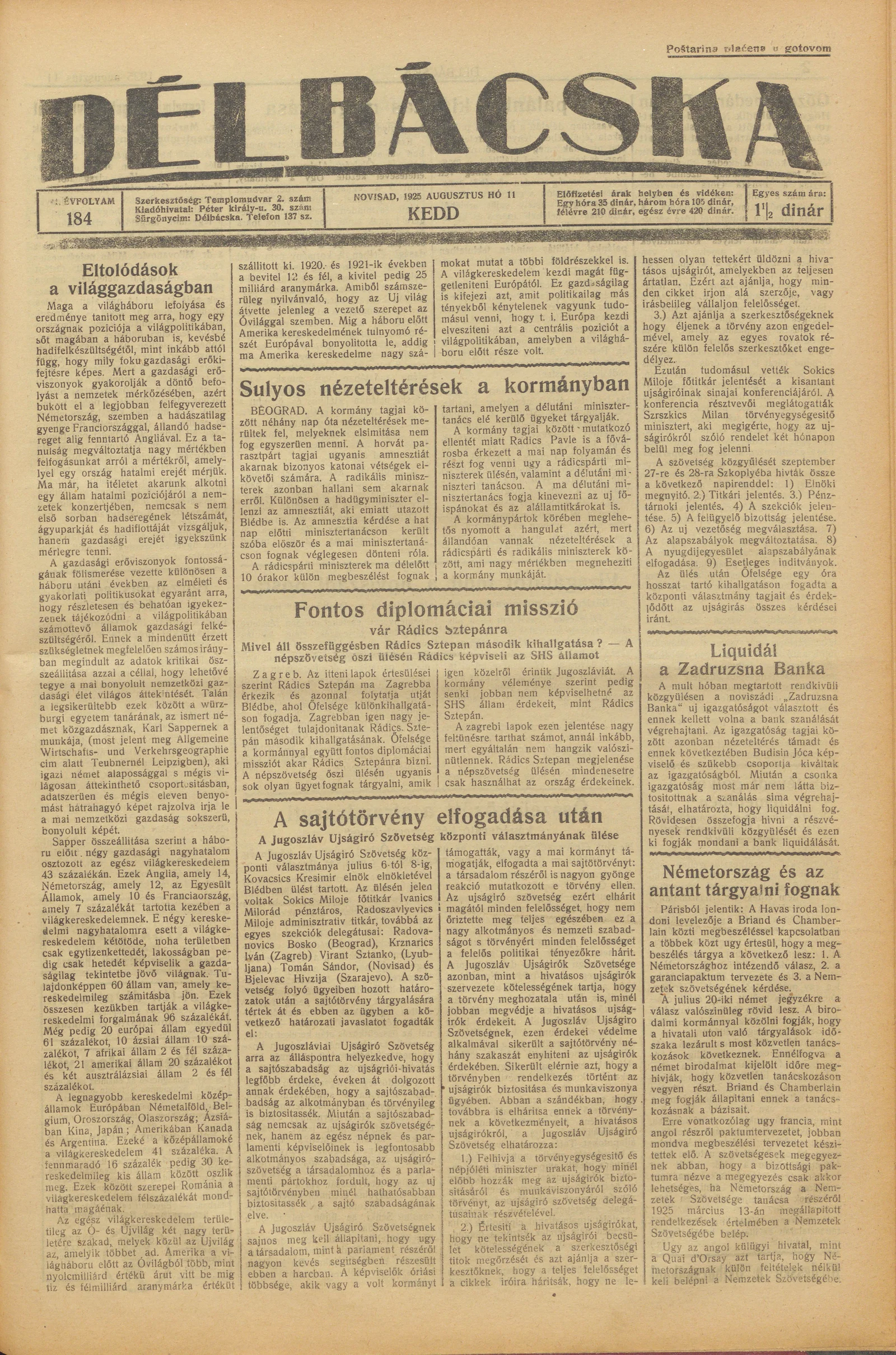 Délbácska, 6. évf. 1925. augusztus 11. 184. sz.