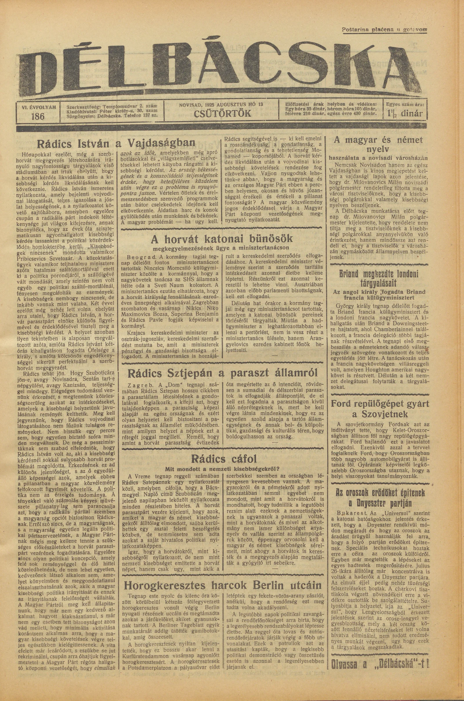 Délbácska, 6. évf. 1925. augusztus 13. 186. sz.