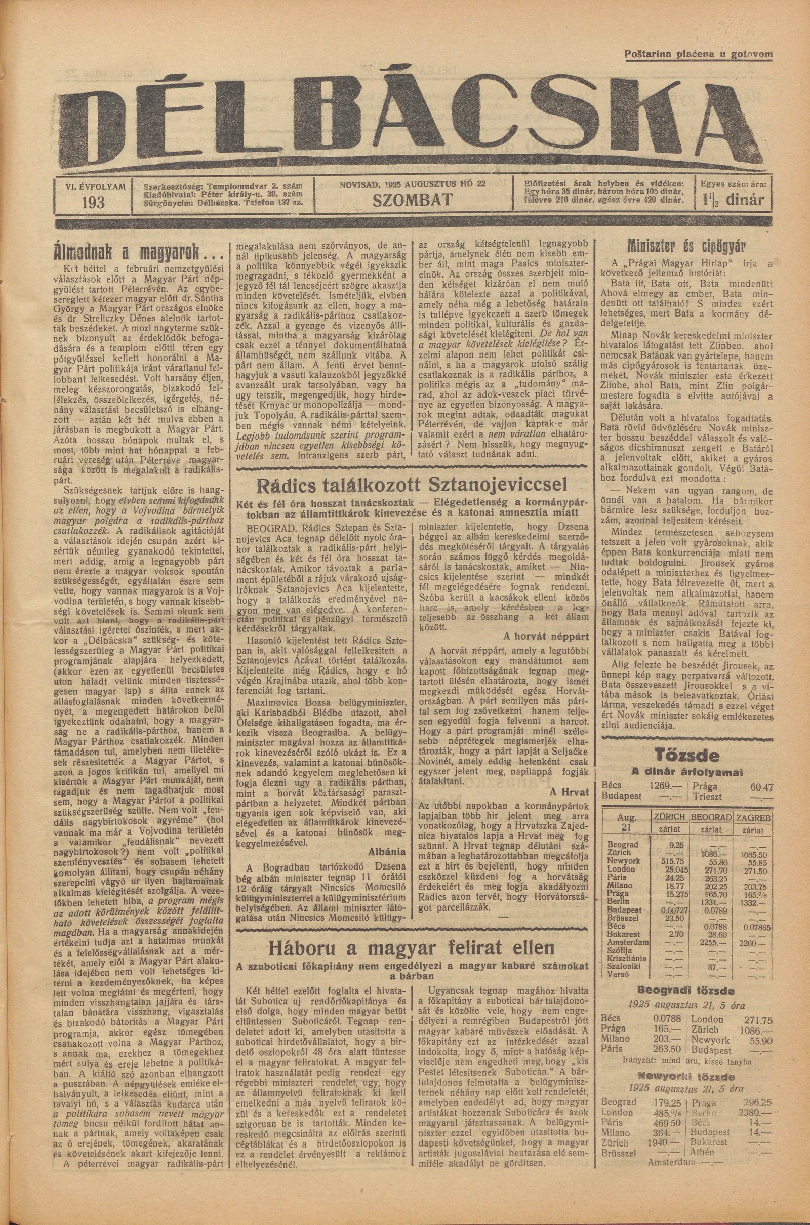 Délbácska, 6. évf. 1925. augusztus 22. 193. sz.