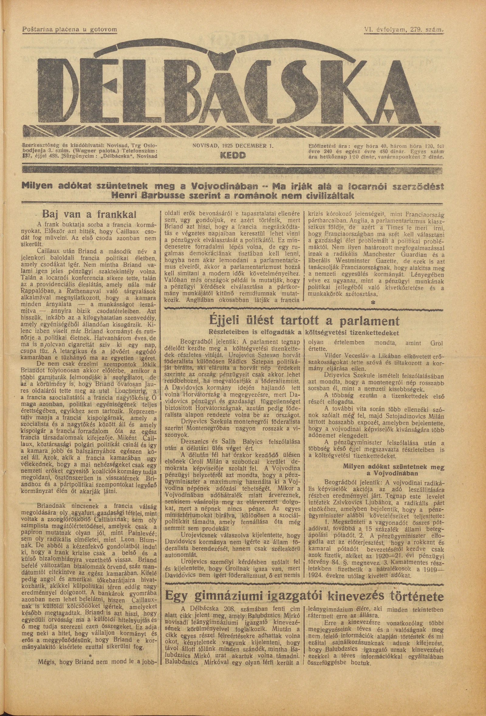 Délbácska, 6. évf. 1925. december 1. 279. sz.