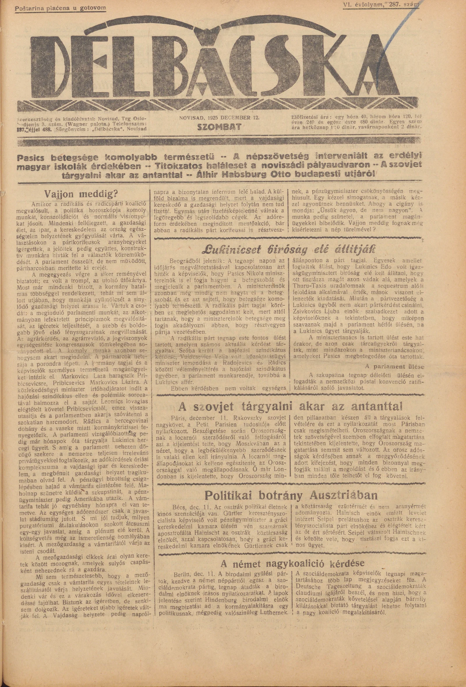 Délbácska, 6. évf. 1925. december 12. 287. sz.