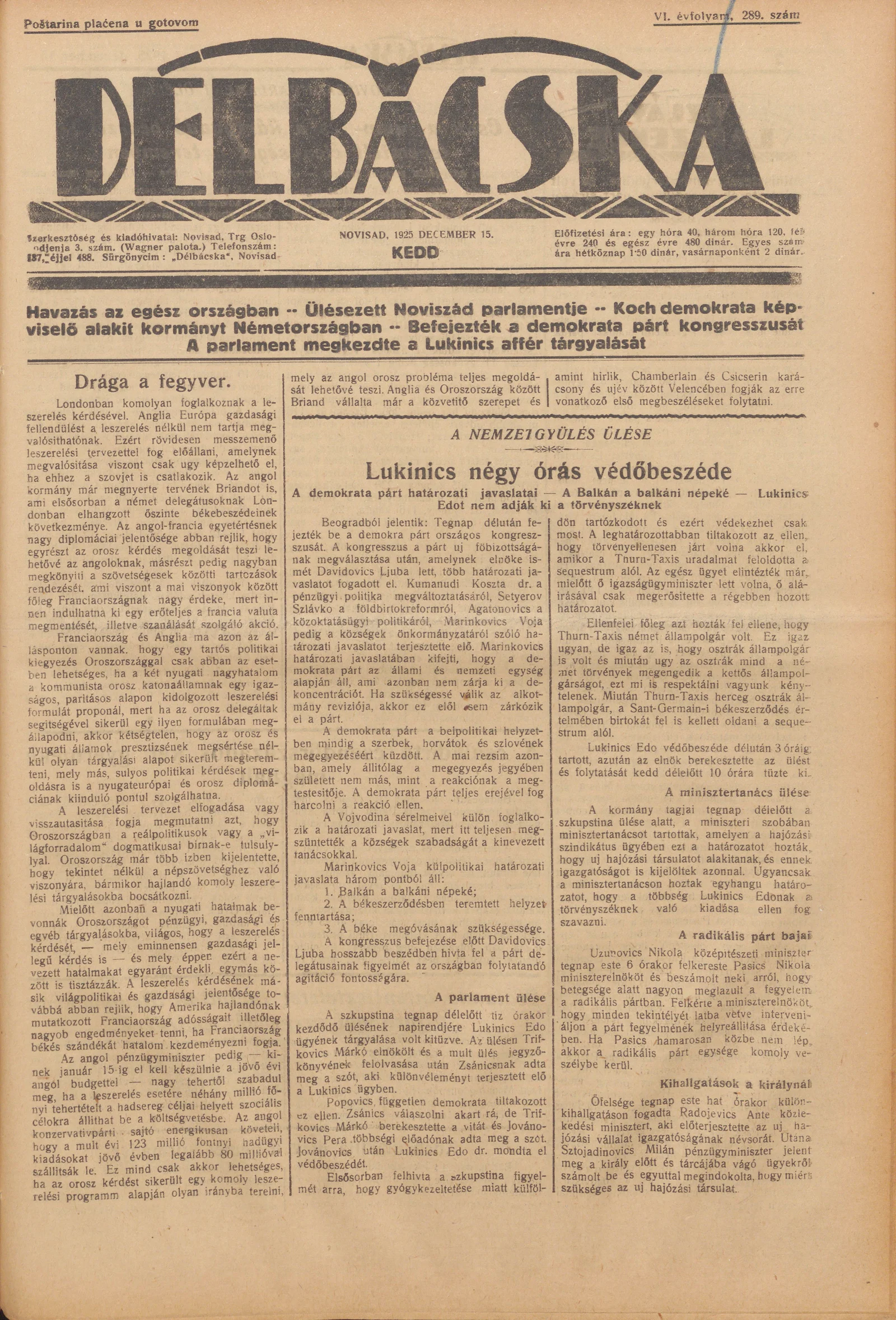 Délbácska, 6. évf. 1925. december 15. 289. sz.