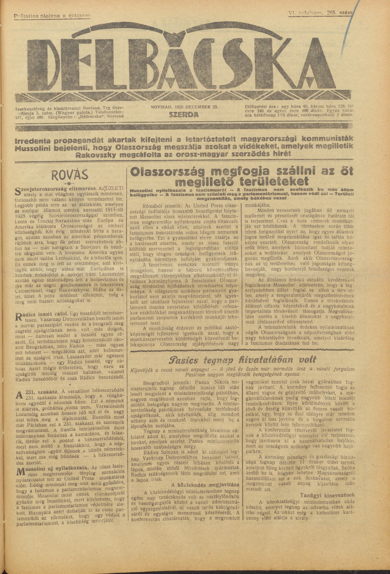 Délbácska, 6. évf. 1925. december 23. 295. sz.