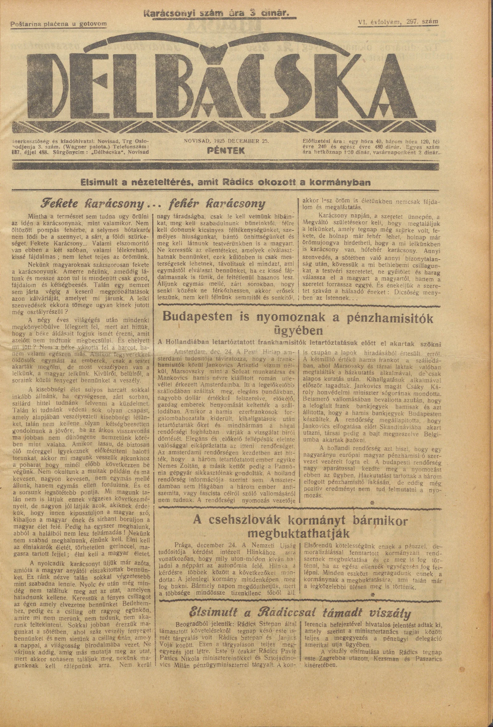 Délbácska, 6. évf. 1925. december 25. 297. sz.