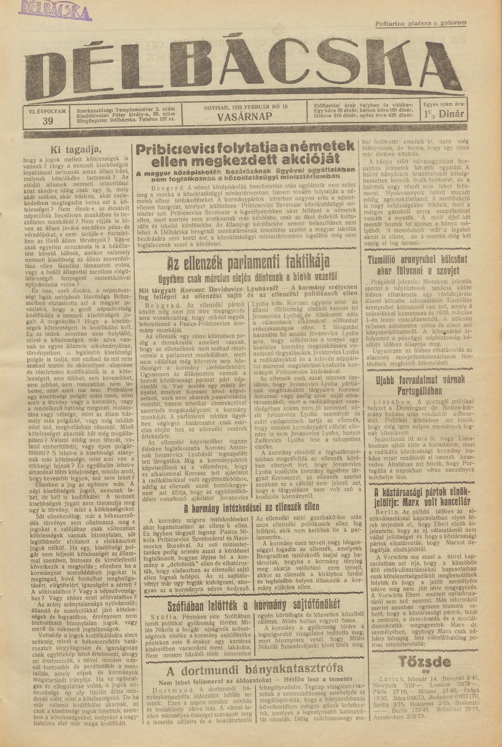 Délbácska, 6. évf. 1925. február 15. 39. sz.