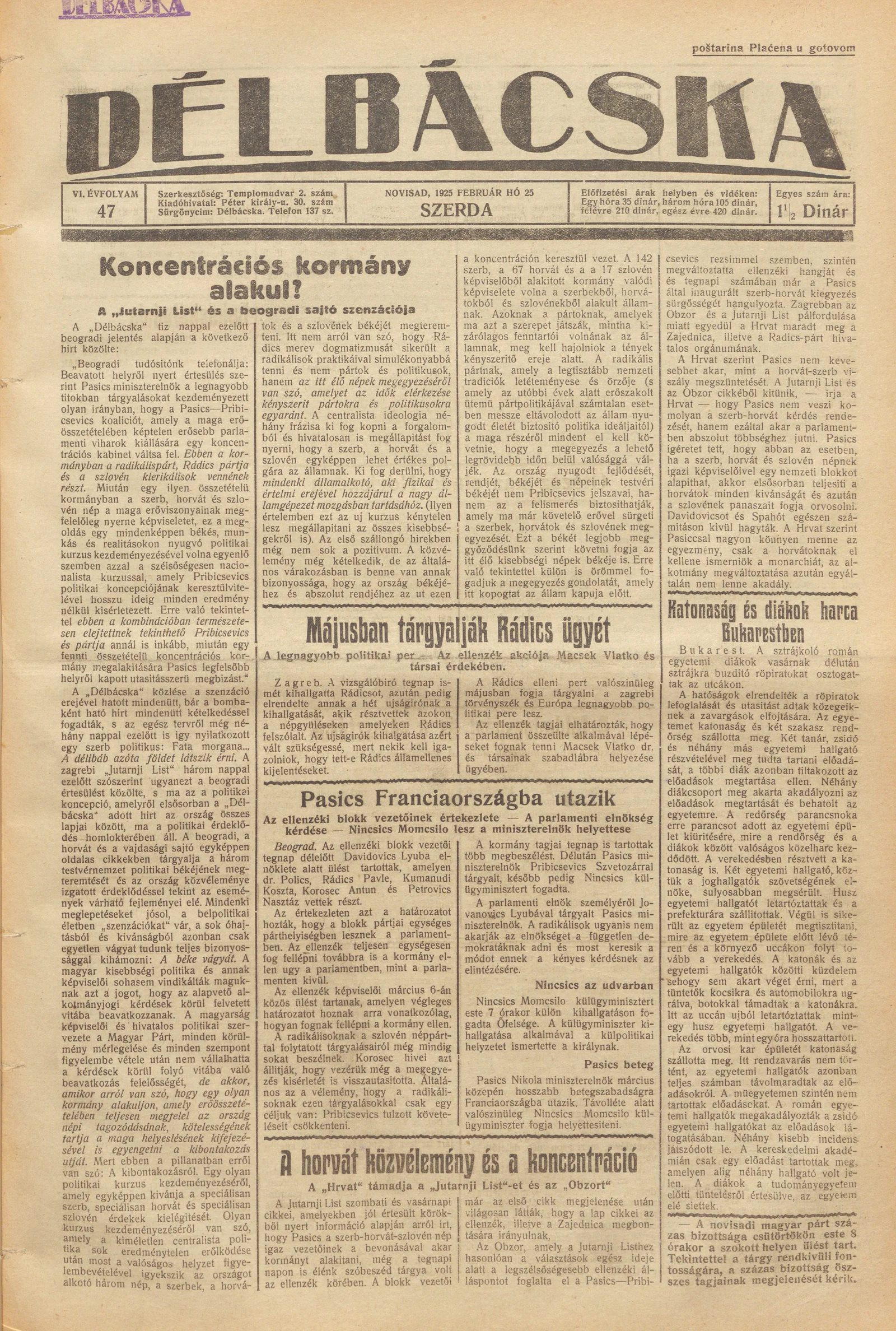 Délbácska, 6. évf. 1925. február 25. 47. sz.