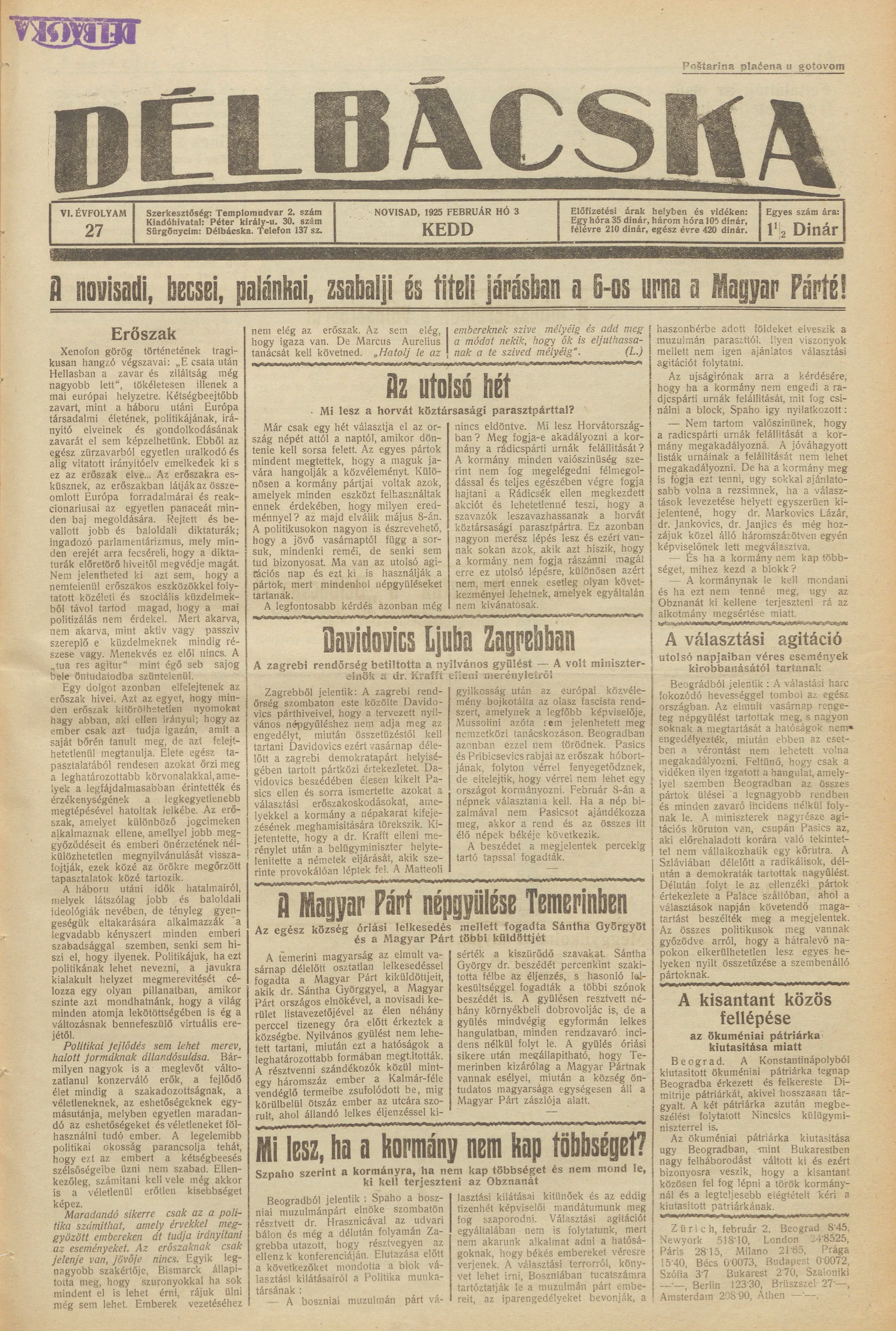 Délbácska, 6. évf. 1925. február 3. 27. sz.