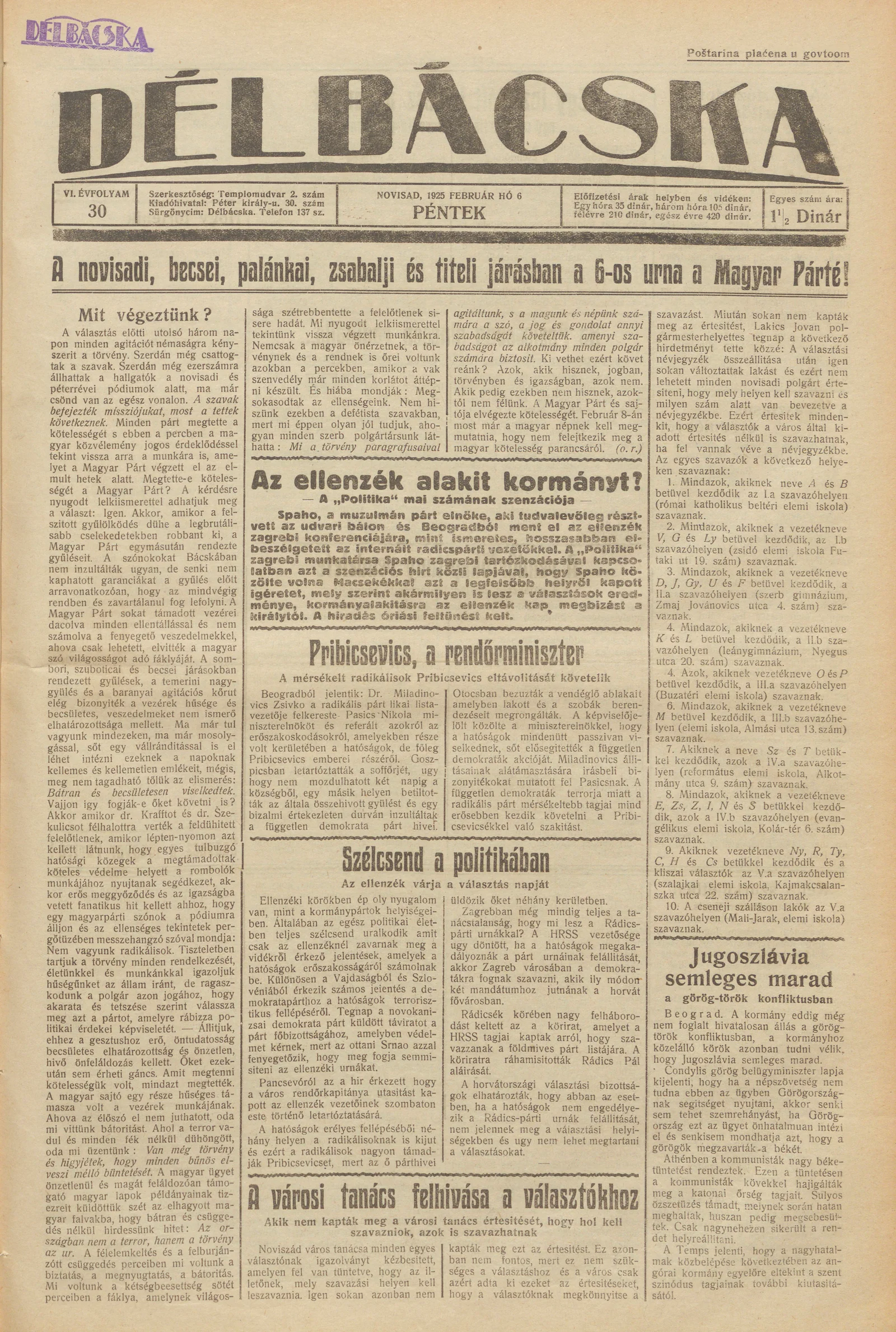 Délbácska, 6. évf. 1925. február 6. 30. sz.