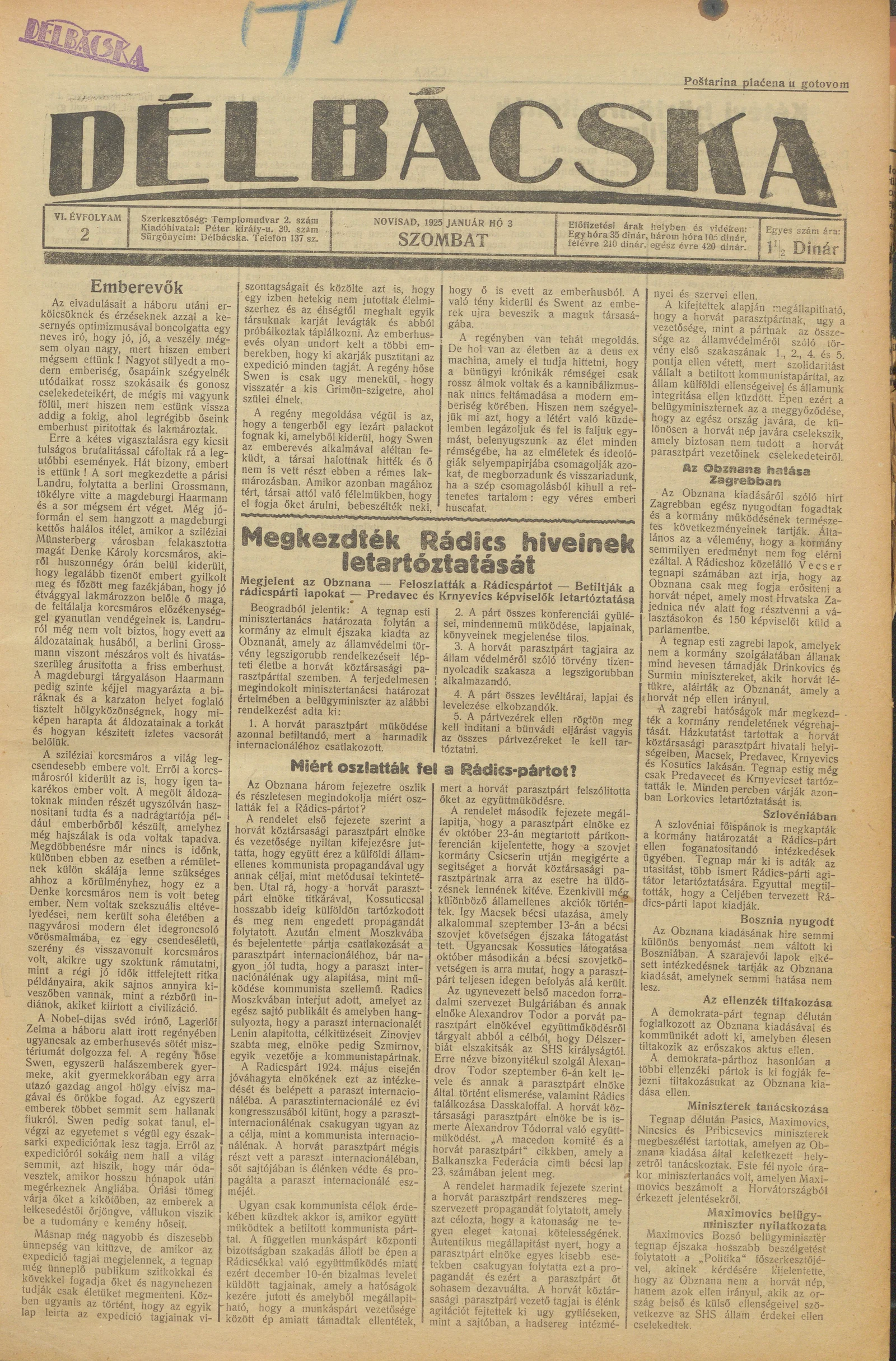 Délbácska, 6. évf. 1925. január 3. 2. sz.