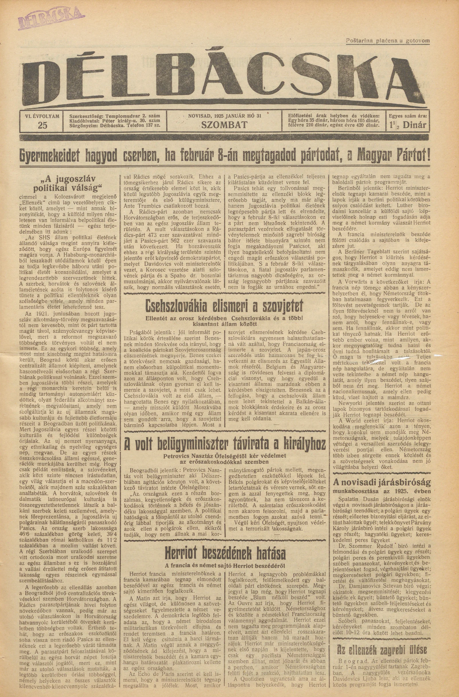 Délbácska, 6. évf. 1925. január 31. 25. sz.