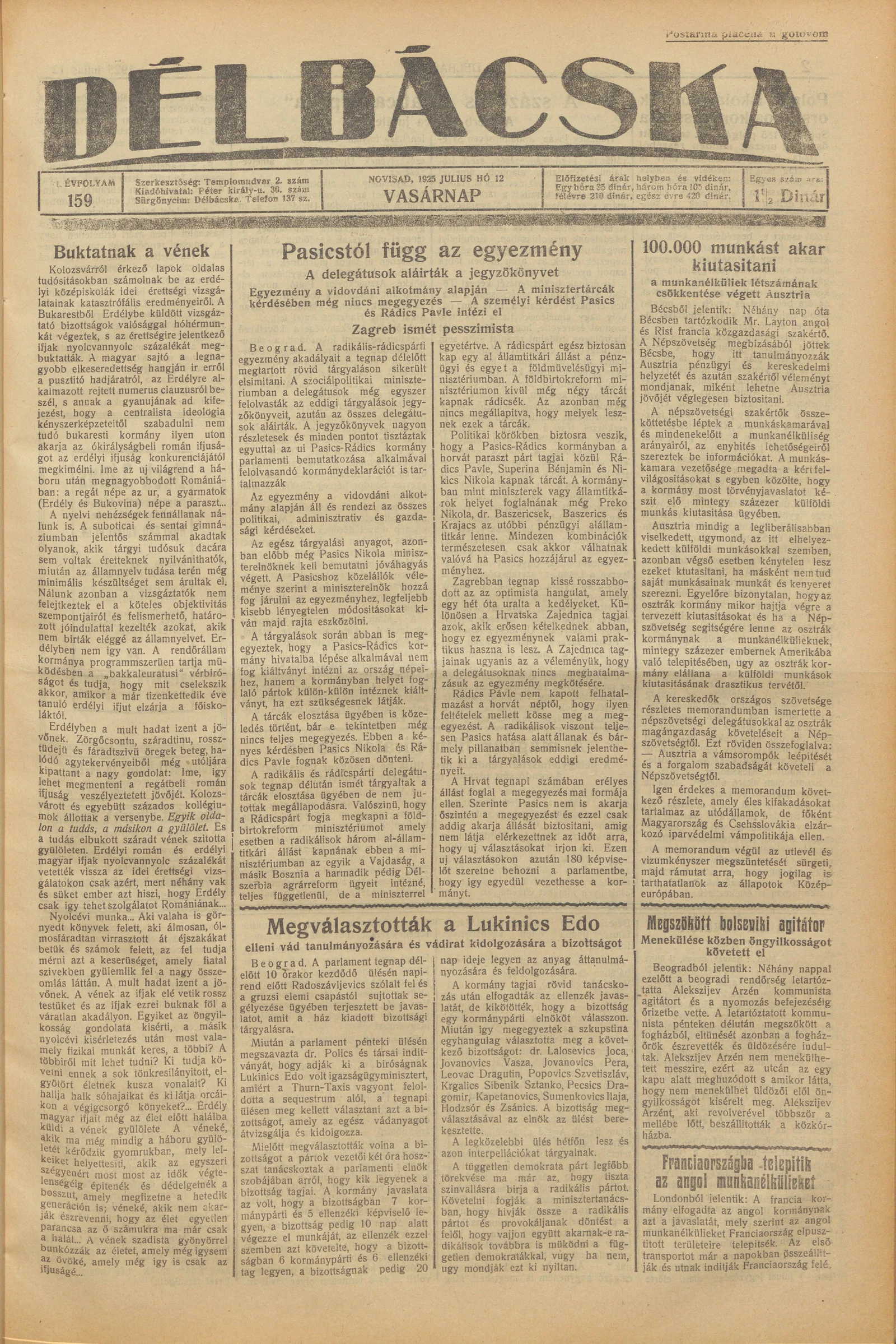 Délbácska, 6. évf. 1925. július 12. 159. sz.