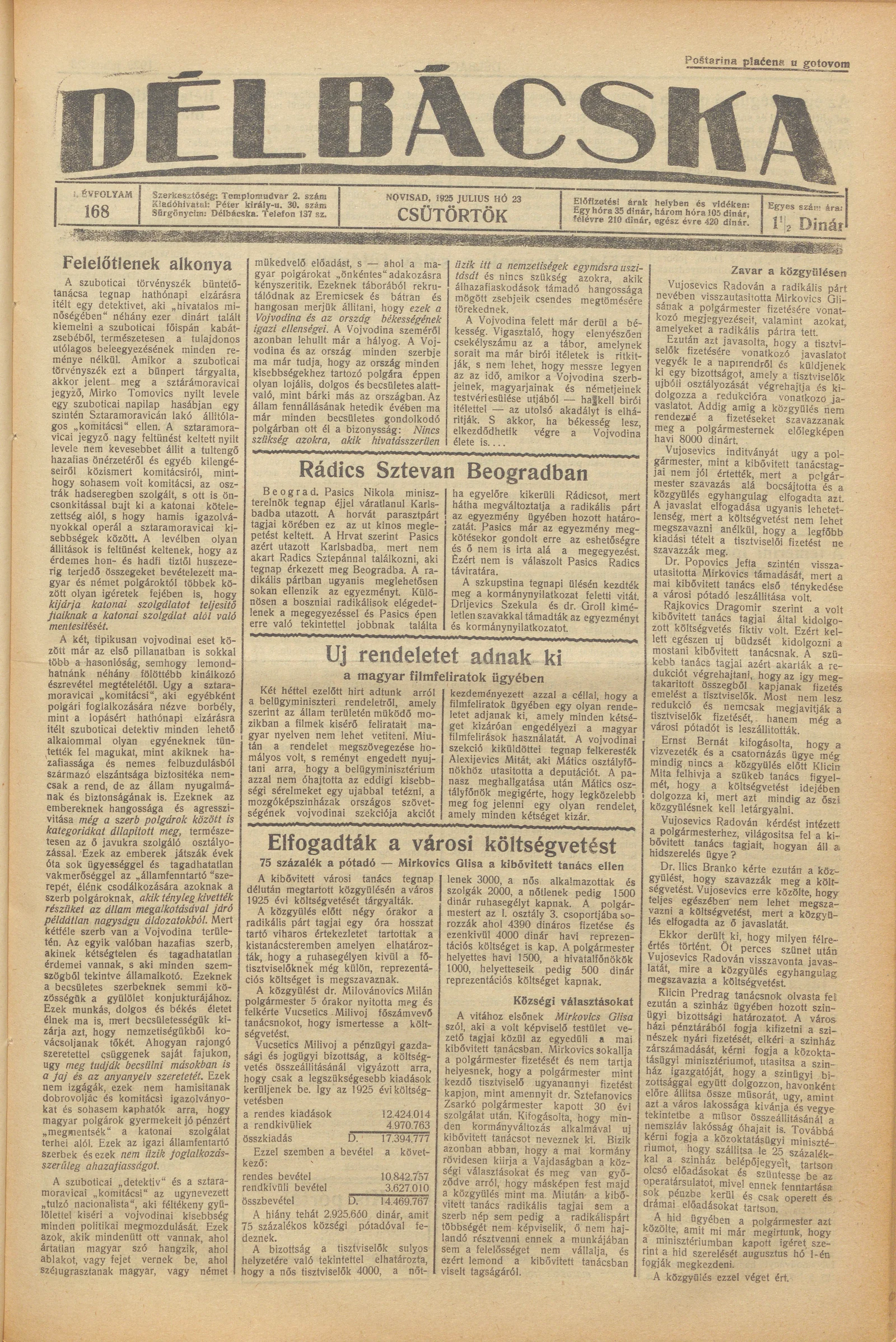 Délbácska, 6. évf. 1925. július 23. 168. sz.