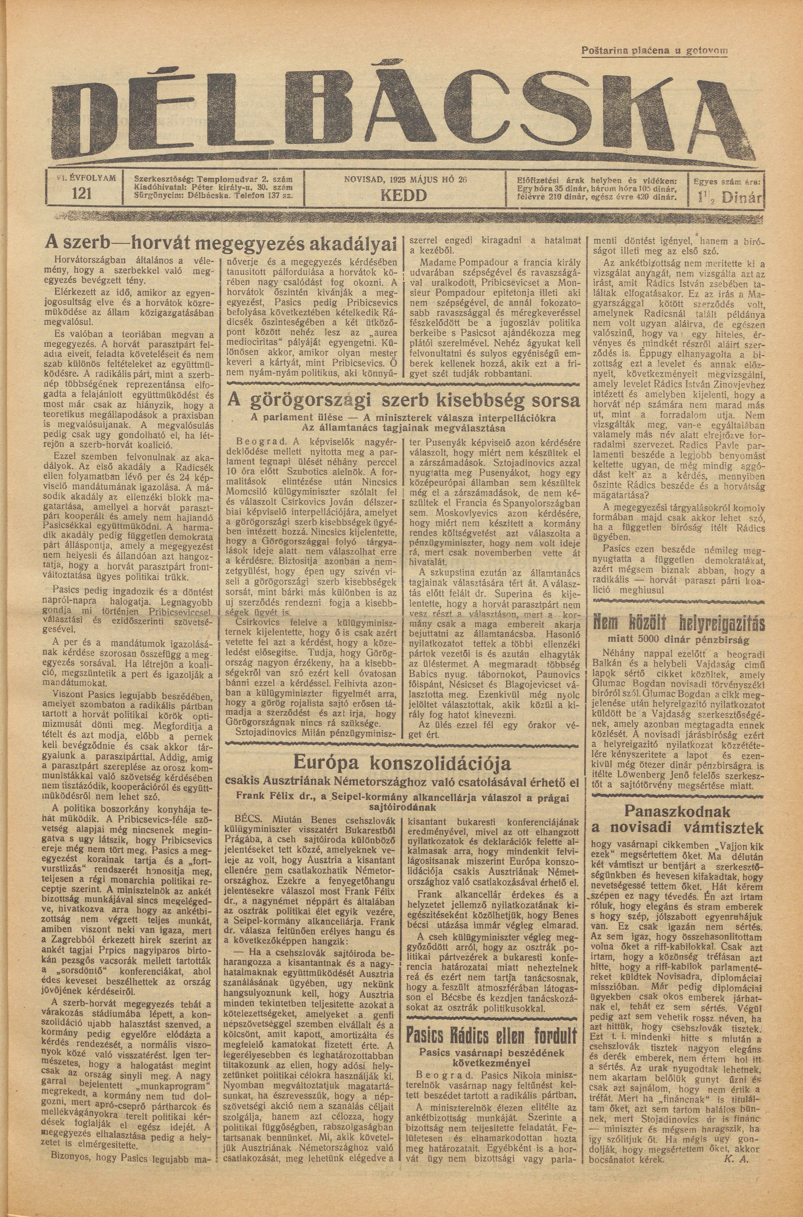 Délbácska, 6. évf. 1925. május 26. 121. sz.